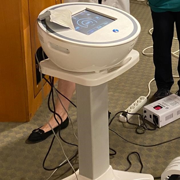 Upon detailed examination of the product’s physical structure, no serious deformation was detected. There are no cracks, breaks, or deep scratches on the casing. On the front face of the device, below the screen, there is an input slot resembling a card reader. On the upper part of the device, there is an antenna, presumed to be used for wireless connection. The application probe has a measurement scale marked from 1 to 10, and the probe itself appears clean and undamaged. The point where the device connects to the stand and the stand itself also have a sturdy appearance.