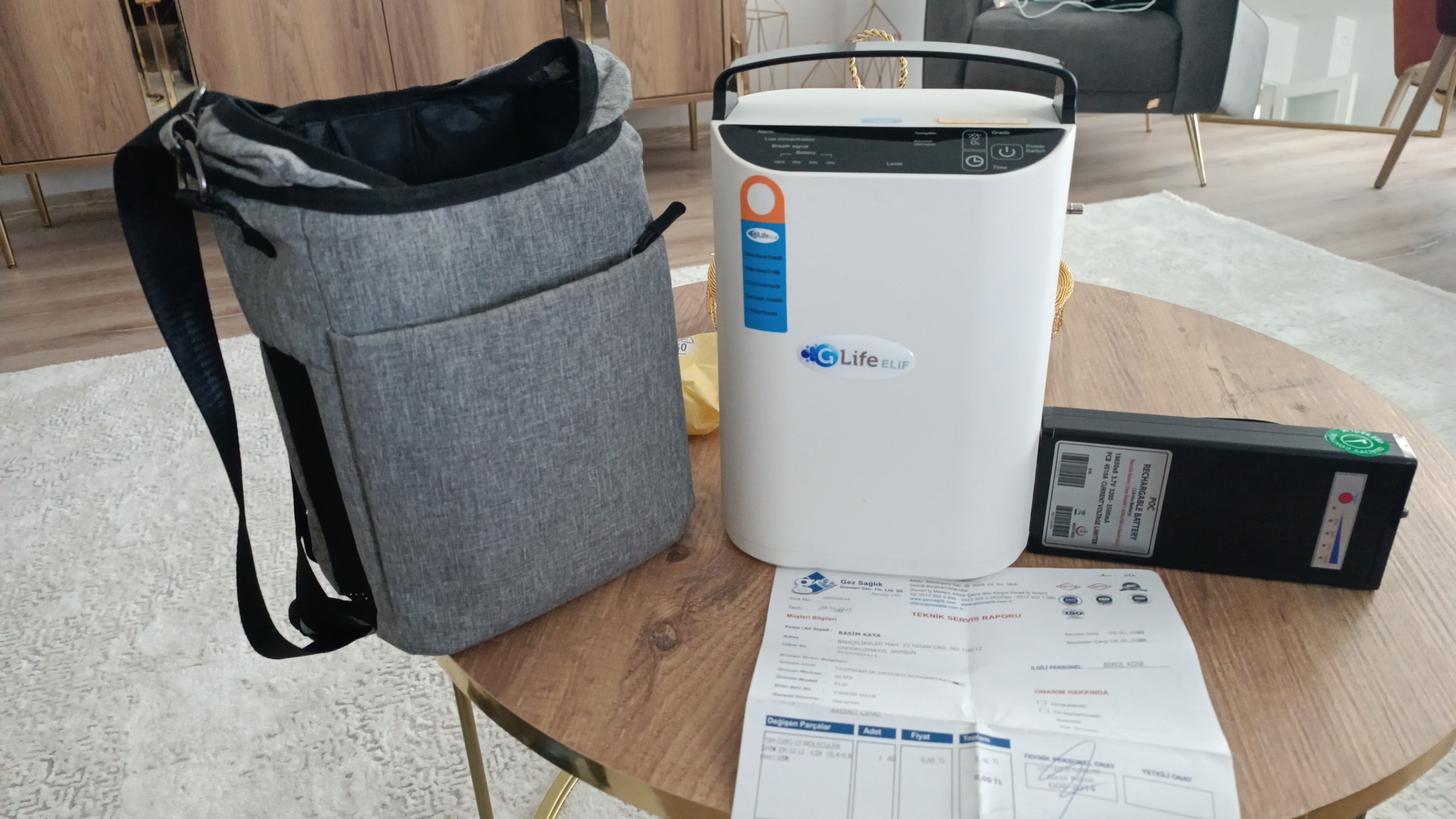 The product shown in the visuals is a portable oxygen concentrator designed for patients requiring respiratory support. According to the label information on the device, it features breath-sensitive automatic oxygen delivery. Thanks to its carrying bag and external battery, it is suitable for mobile use and oxygen therapy during travel.