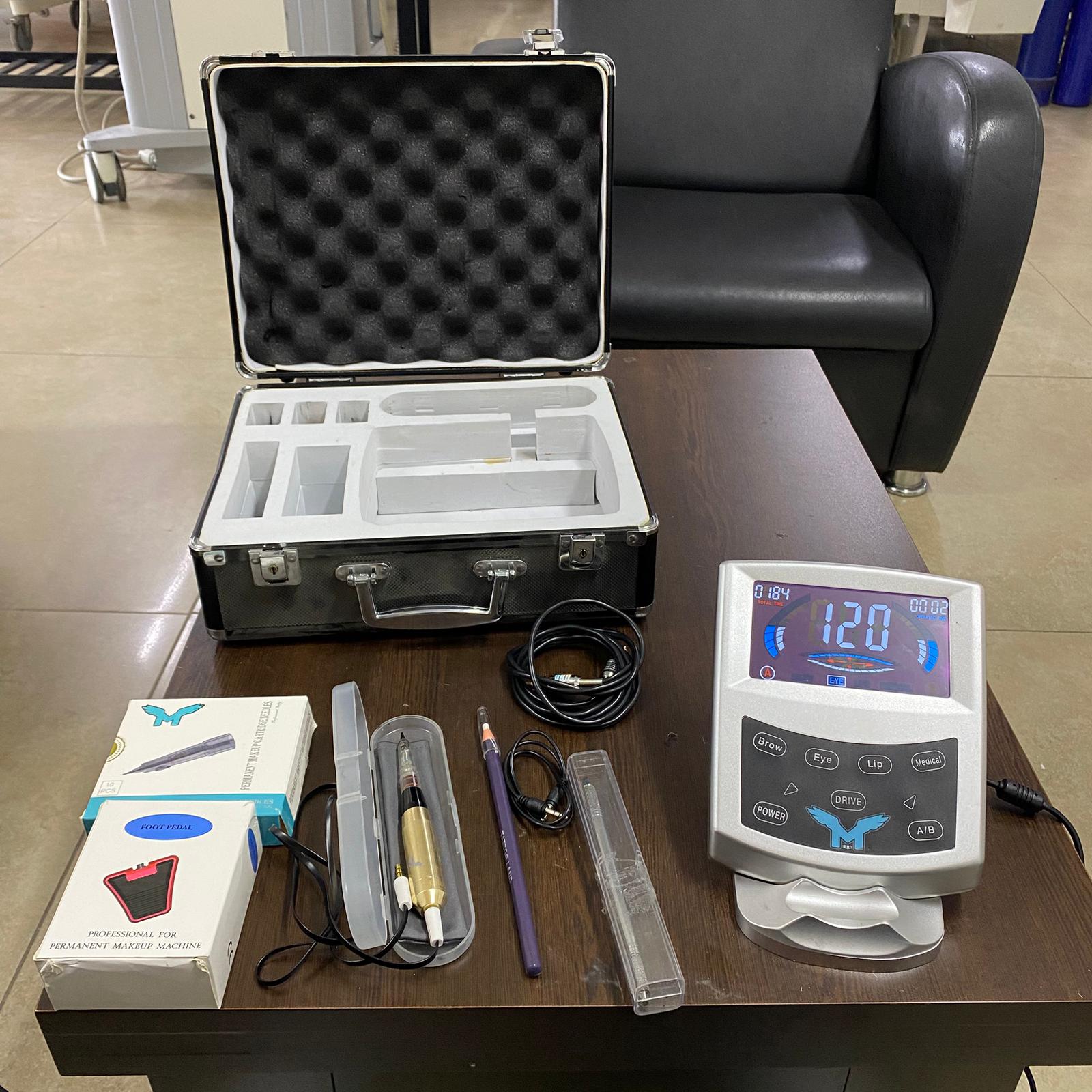 The visuals display a permanent makeup device set designed for professional use. The set consists of a main control unit, an application pen, a foot pedal, connecting cables, needle cartridges, and a carrying case. It is understood from the buttons on the device that it is used for eyebrow, eye, lip, and medical procedures.