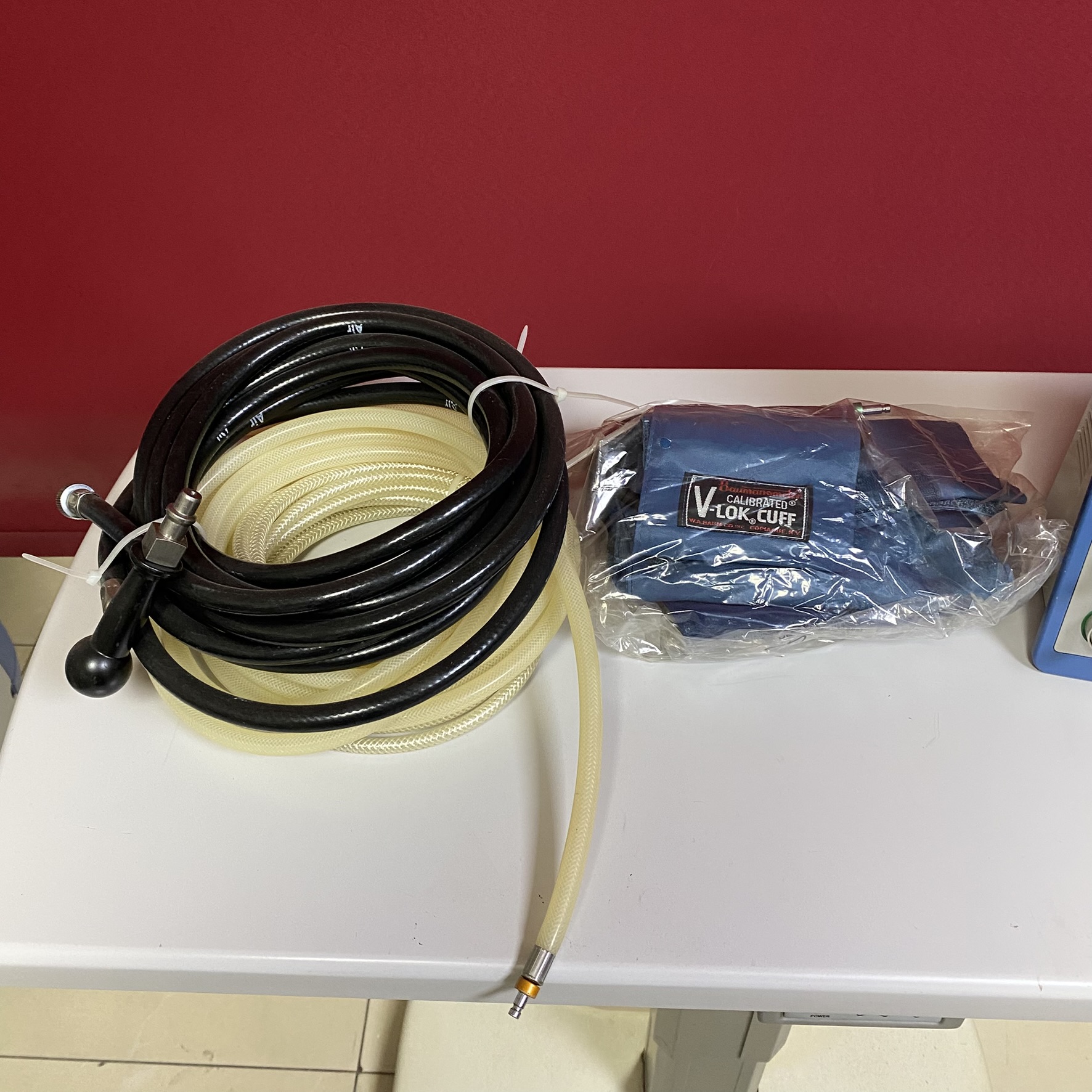 The examined visuals show a professional pneumatic tourniquet system used to stop blood flow during surgical operations. The device consists of a main control unit, attached air hoses, and one cuff accessory. The product is in the form of a single-piece monitor/control unit, with detachable components alongside it.