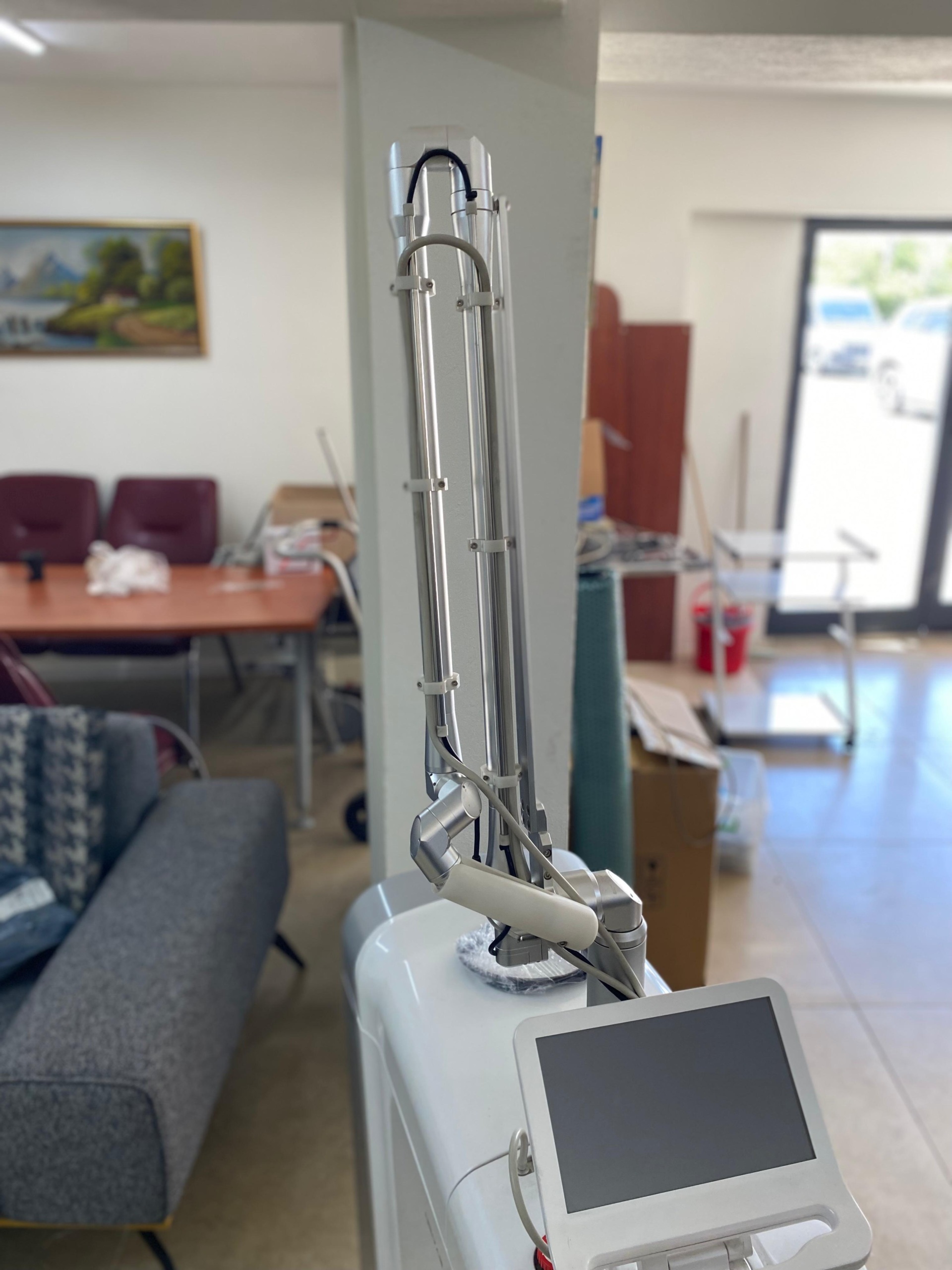 - Mechanical Components: The 4 wheels that enable the device to move on the floor appear sound. The push and pull handle at the front is intact. The joints and physical integrity of the metallic articulated arm that directs the laser beam are preserved.