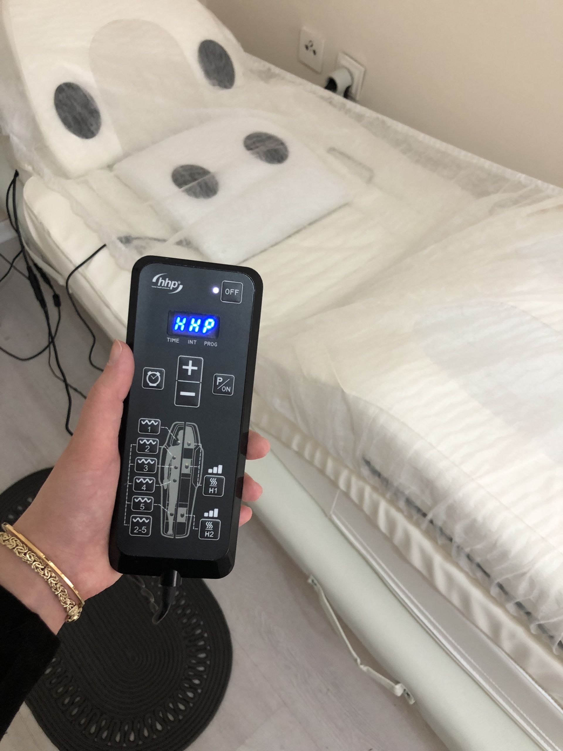 The device is controlled via a handheld remote connected to the bed with a thick black cable. The remote control is made of black hard plastic. There is a blue digital LED screen on the remote control. The visual shows the device in operation, with the text HHP appearing on the screen. Immediately below the screen, the labels TIME, INT, and PROG are located, respectively.