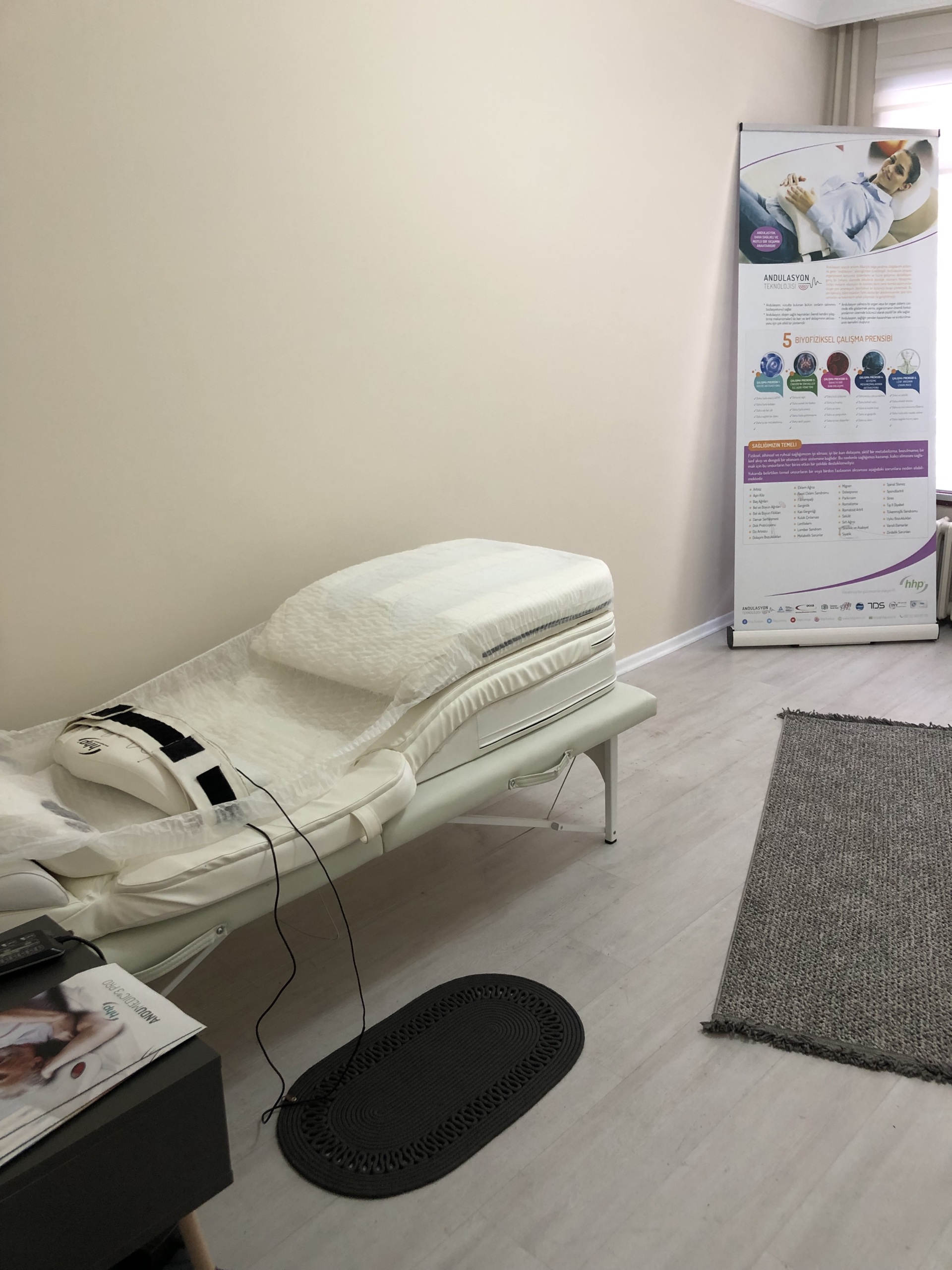 The product shown in the visuals is an andulation therapy system consisting of a foldable support frame and a therapy bed placed on this frame. The Hhp brand is clearly visible on the device’s support frame, the handheld remote control, the promotional poster in the background, and the printed material on the table. The model name is stated as Andumedic 3 Pro in the booklet on the table. Upon examining the logo quality, material integrity, and control interface of the device, the product is assessed to be original.