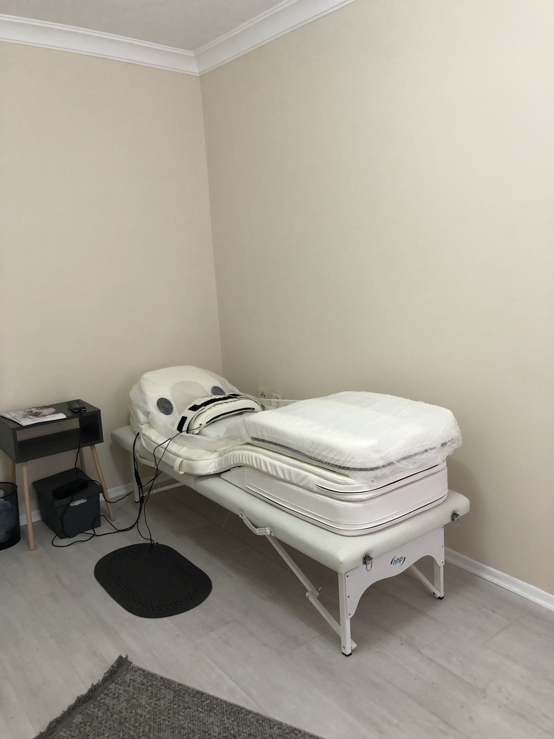 The device is generally clean, unworn, and well-maintained. The upper surface of the therapy bed is covered with a thin, transparent cover to protect it from external factors. The overall condition of the device is high, and it does not show any significant signs of deformation due to intensive use.