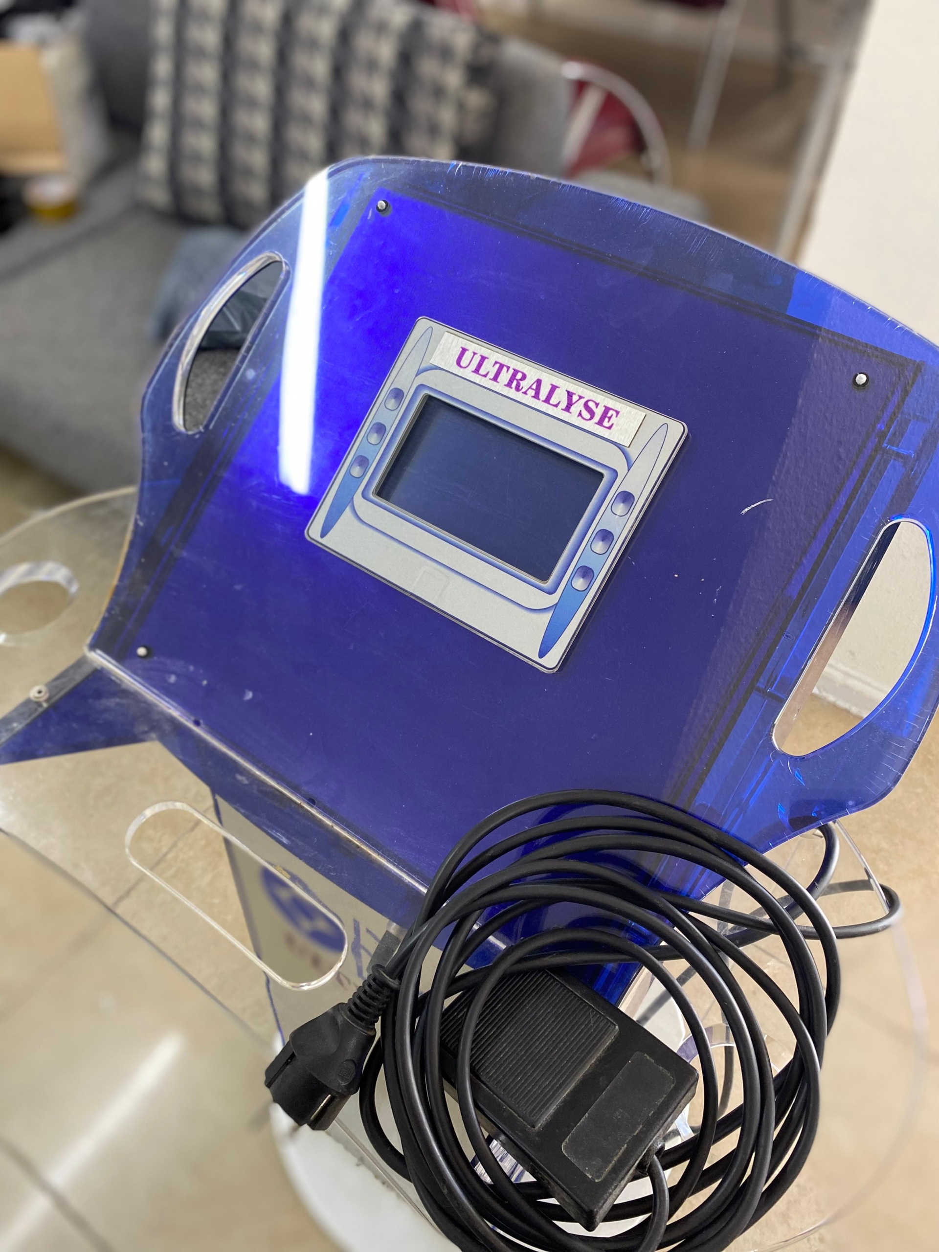 The product shown in the images is a Bios brand, Ultralyse model device. The device consists of a main unit integrated onto a wheeled or fixed stand, and accessories connected to this unit. The general design of the device and the “Ultralyse” model name suggest that the product is a body care or treatment device typically used in aesthetic and cosmetic fields. It is understood that the product is original from the quality of the brand and model inscriptions on it and the overall workmanship.