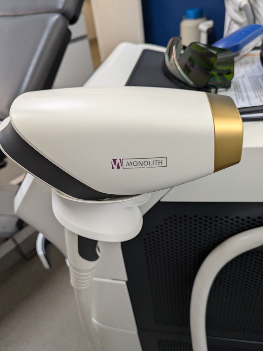 - Handpiece Model: The inscription “MONOLITH” and “Asclepion Laser Technologies” below it are clearly visible on the handpiece section of the device. The gold-colored tip and ergonomic design of the handpiece reflect the characteristic features of this model.