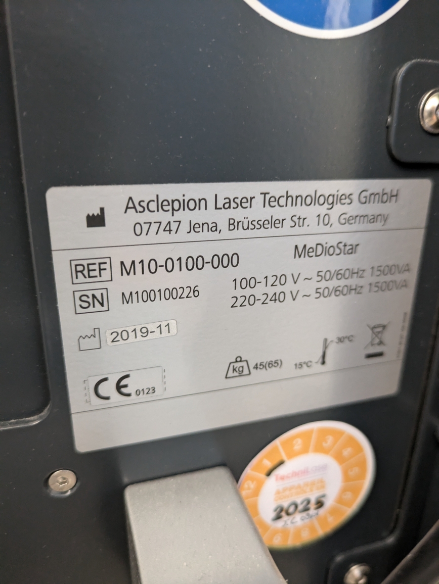 - Device Brand and Model: The inscription “MeDioStar” is clearly visible on the front of the device, and “Asclepion Laser Technologies GmbH” is stated as the manufacturer on the rear information label, with “MeDioStar” again as the model name. The brand logo, a purple dotted pattern, is present on the front panel.