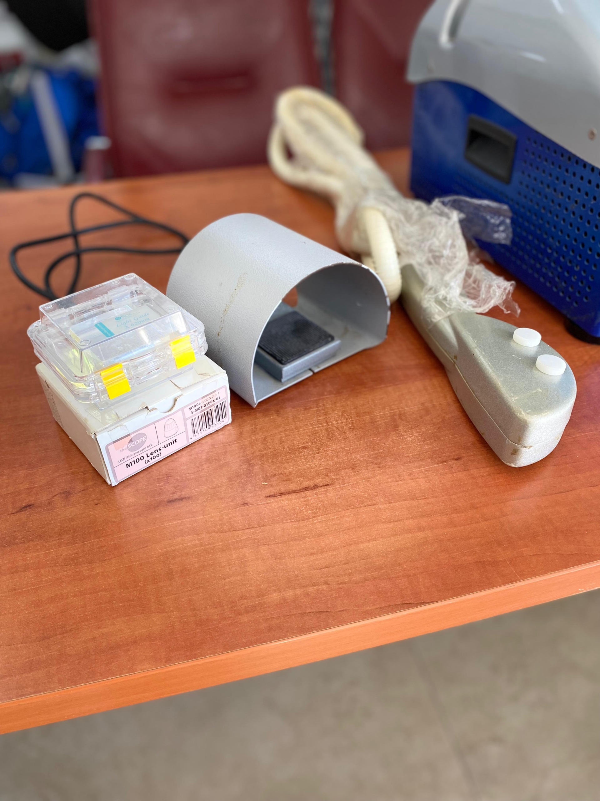 The device is shown with one footswitch and one application handpiece with its hose. Additionally, there is a lens unit inside its original box labeled “the SCOPE” and “M100 Lens-unit (x100)”. A barcode and the text “M100レンズユニット S-M01-0100X-01” are readable on the box. No information regarding the expiration date of this lens unit is available in the images.