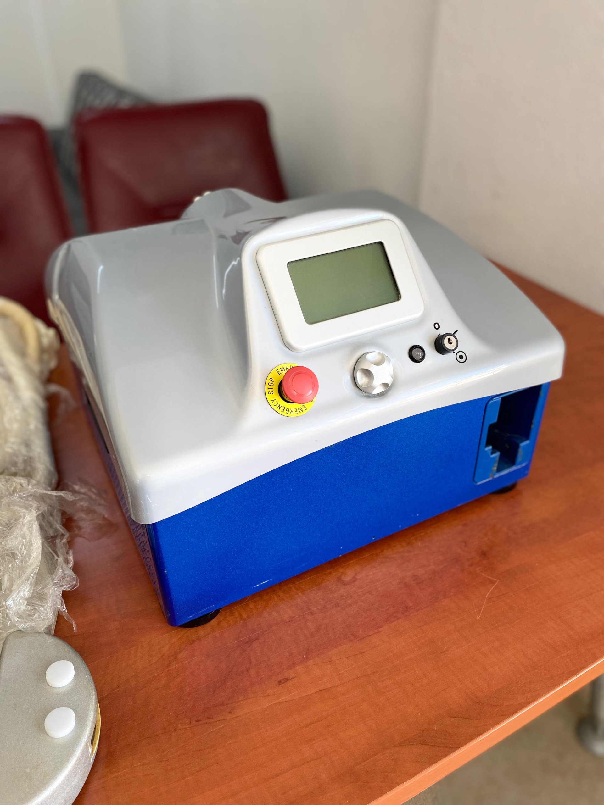 The emergency stop button, key slot, and adjustment knob on the device’s main unit are in place. The two white buttons on the application handpiece appear to be intact. The mechanism of the footswitch maintains its integrity. The nylon wrapping on the connection hose prevents a full assessment of the hose’s condition.