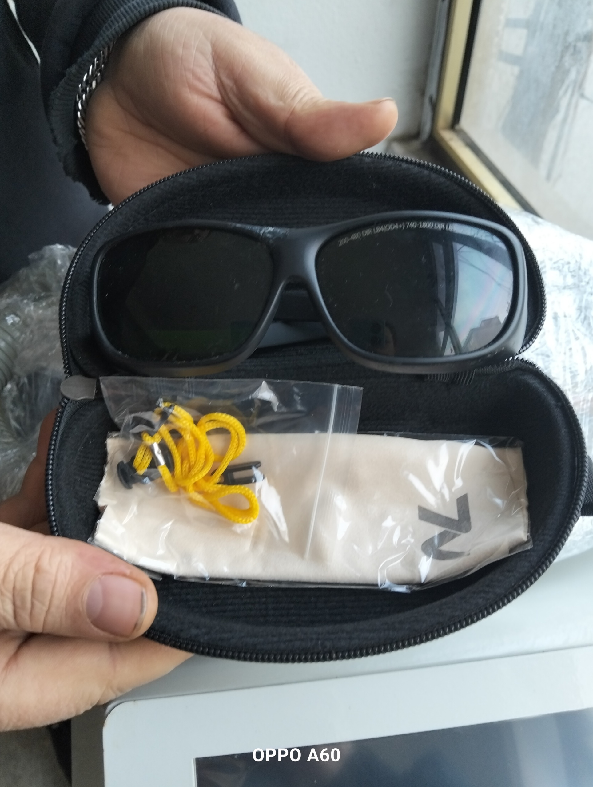 - 1 Protective Eyewear and Case: A black, zippered, hard protective case contains one pair of laser protective glasses. The spectacle frame and lenses are sturdy.