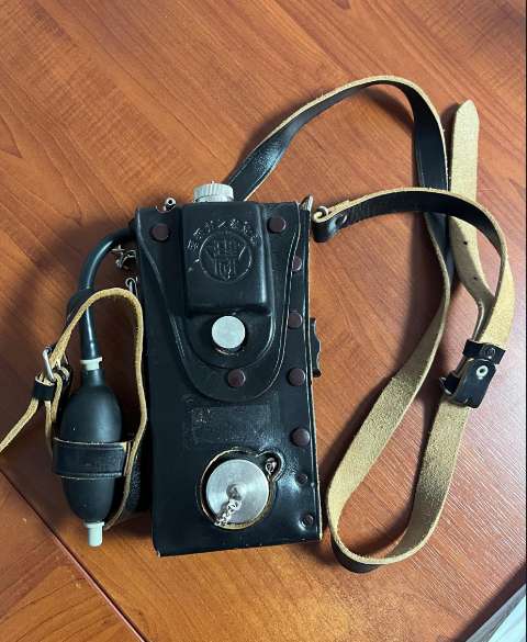 The examined visuals belong to a portable, analog, and optical-based gas measuring device. The device is displayed as a complete system, including a heavy-duty leather carrying case, a manual pump (aspirator bulb) used for air suction, and a shoulder strap. The product’s design language, the materials used (leather, cast metal body, chain-attached covers), and its labeling indicate that it is a vintage measuring instrument intended for industrial safety purposes.