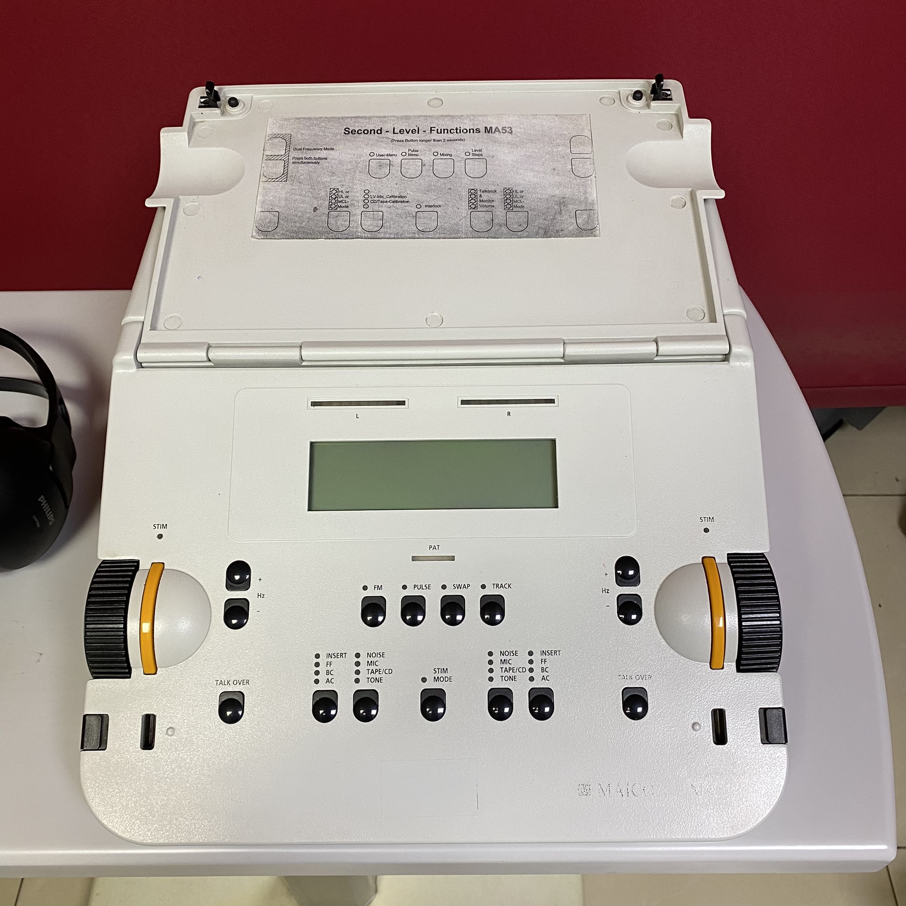 - Audiometer Device: Based on the plastic embossed logo in the lower right corner of the device and the inscriptions on the reference card located on its top cover, the brand has been identified as MAICO and the model as MA 53.