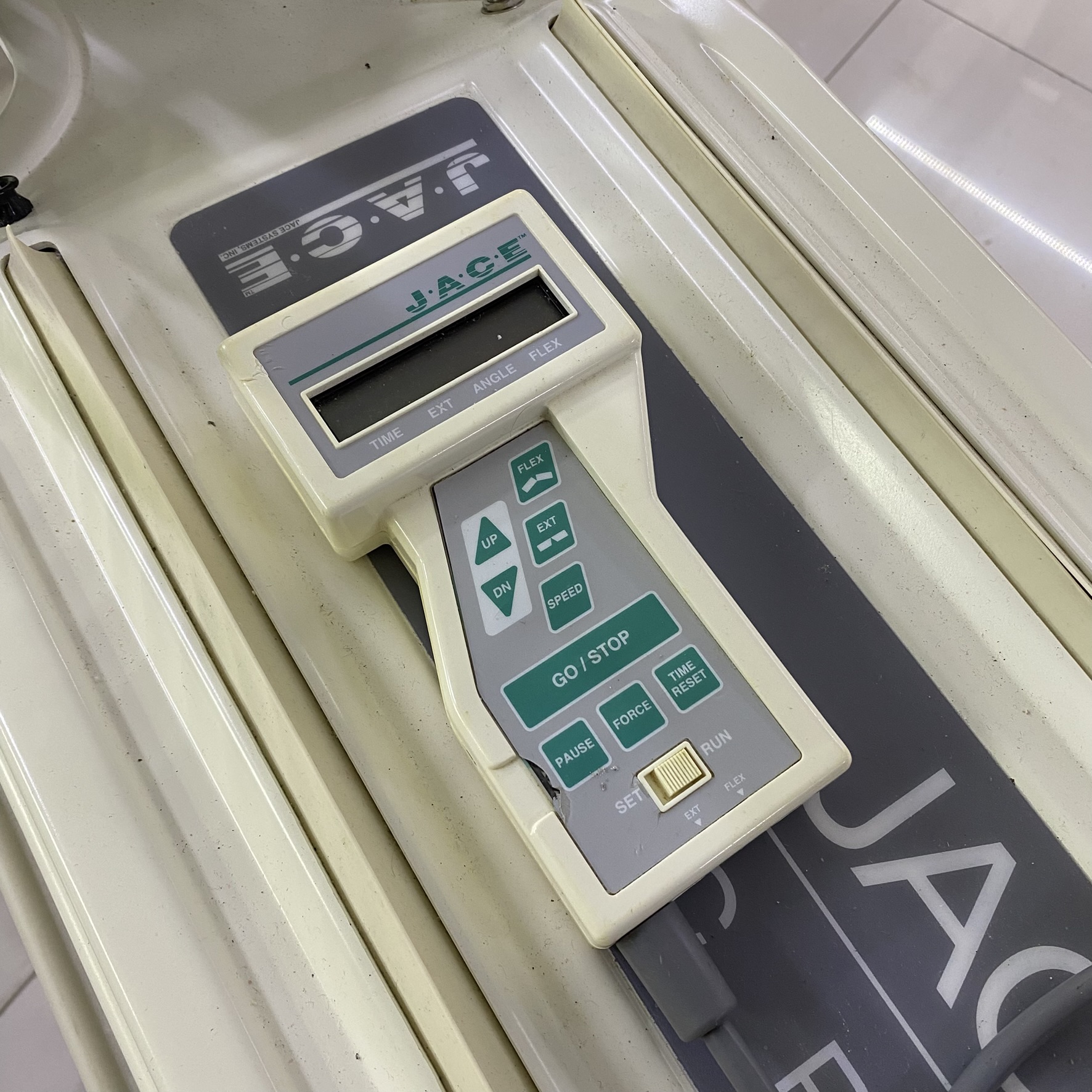 - Brand: JACE (JACE and JACE Systems logos are clearly visible both on the label on the main body of the device, on the graphics on the leg rest part, and on the hand control.)