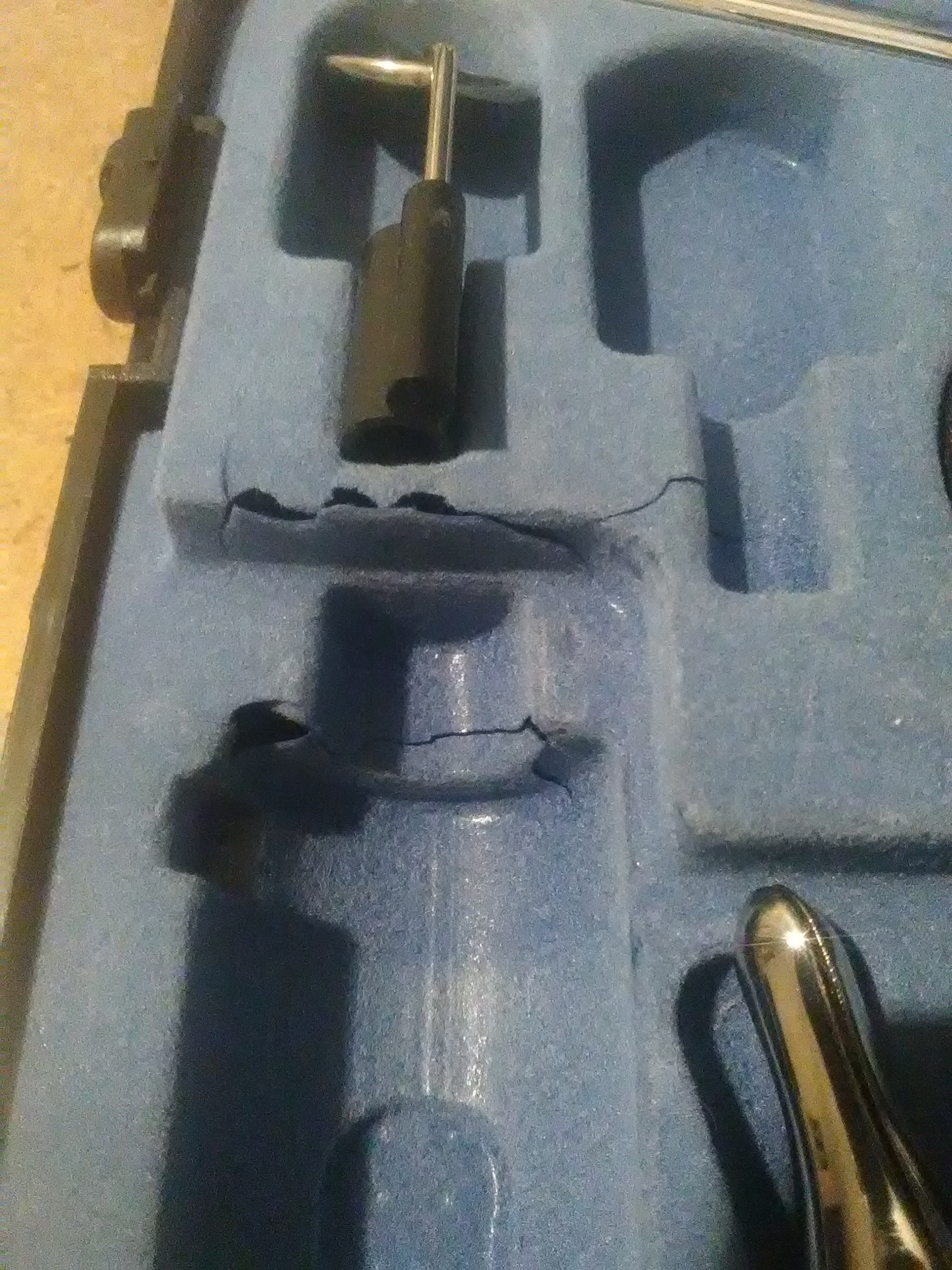 - Inner Box Sponge: The blue protective sponge slot shows significant wear, cracking, and tears. Due to its chemical structure, the foam material has entered a decomposition process over time.