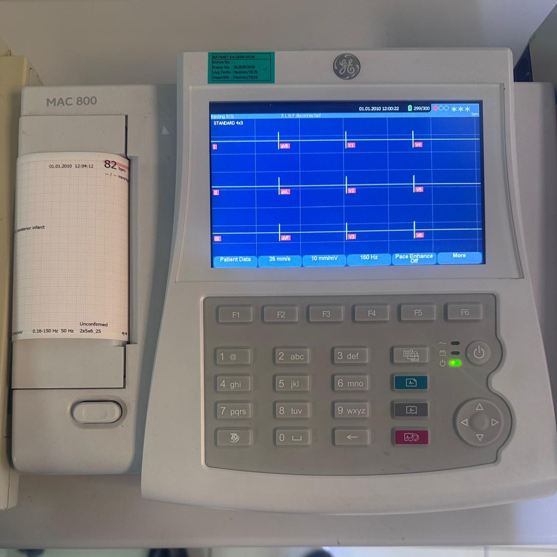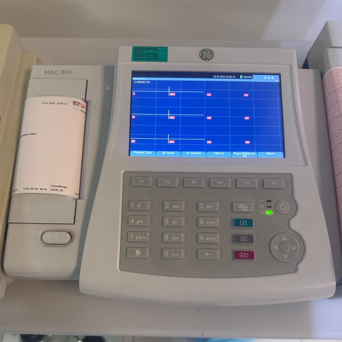 Upon examining the logos, model number inscriptions, and design language on the device, it has been clearly and definitively determined that the manufacturer brand is GE (General Electric) and the model is MAC 800. The inscription “MAC 800” is clearly readable on both the front panel of the device and the printer unit cover.