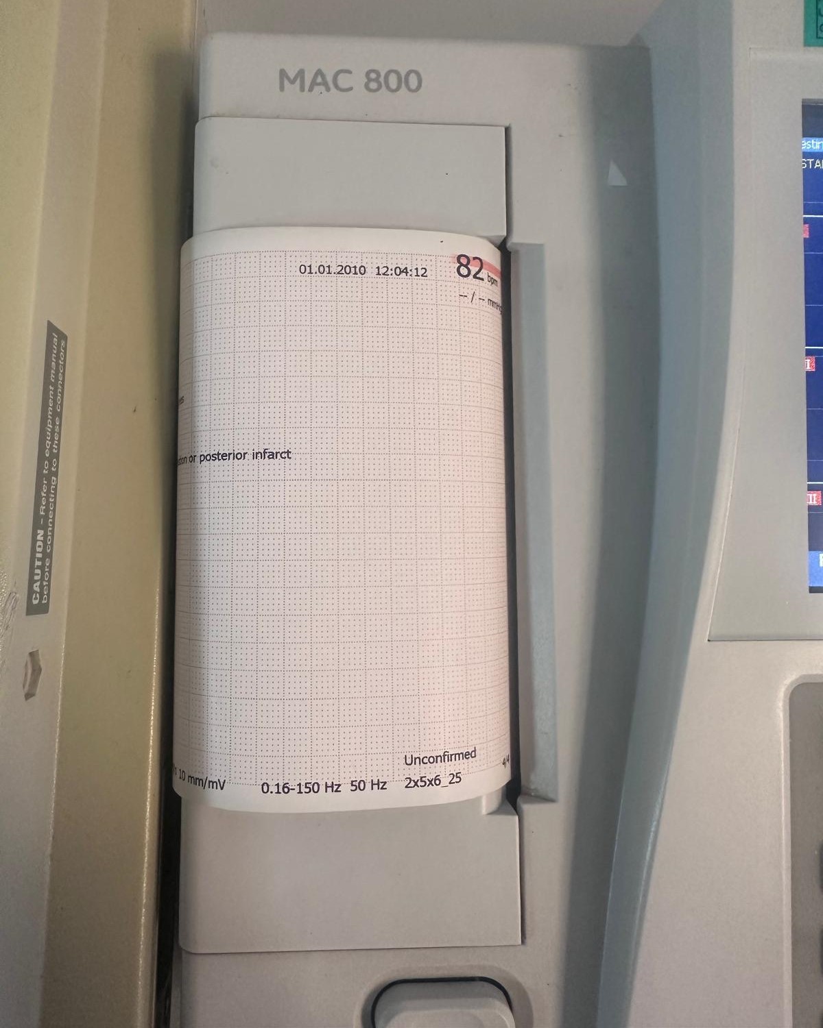 - Paper Output Information: On the thermal paper, there are inscriptions “Unconfirmed”, “0.16-150 Hz”, “50 Hz” (mains filter), “25x5x6_25”, and “82 bpm” (82 heartbeats per minute – could be a simulation or artifact).