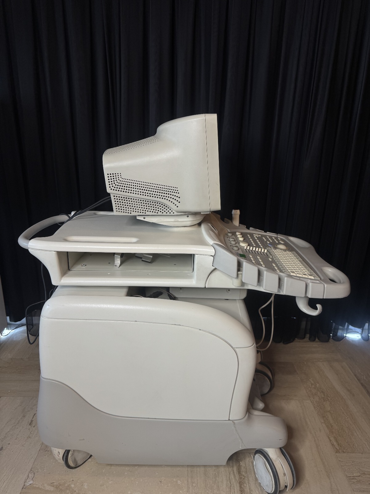 As a result of the detailed visual analysis, the medical imaging device examined was identified as a mobile (wheeled) ultrasound system. The brand and model of the device were 100% definitively confirmed through original logos, labels, and prints found at different points on the product.