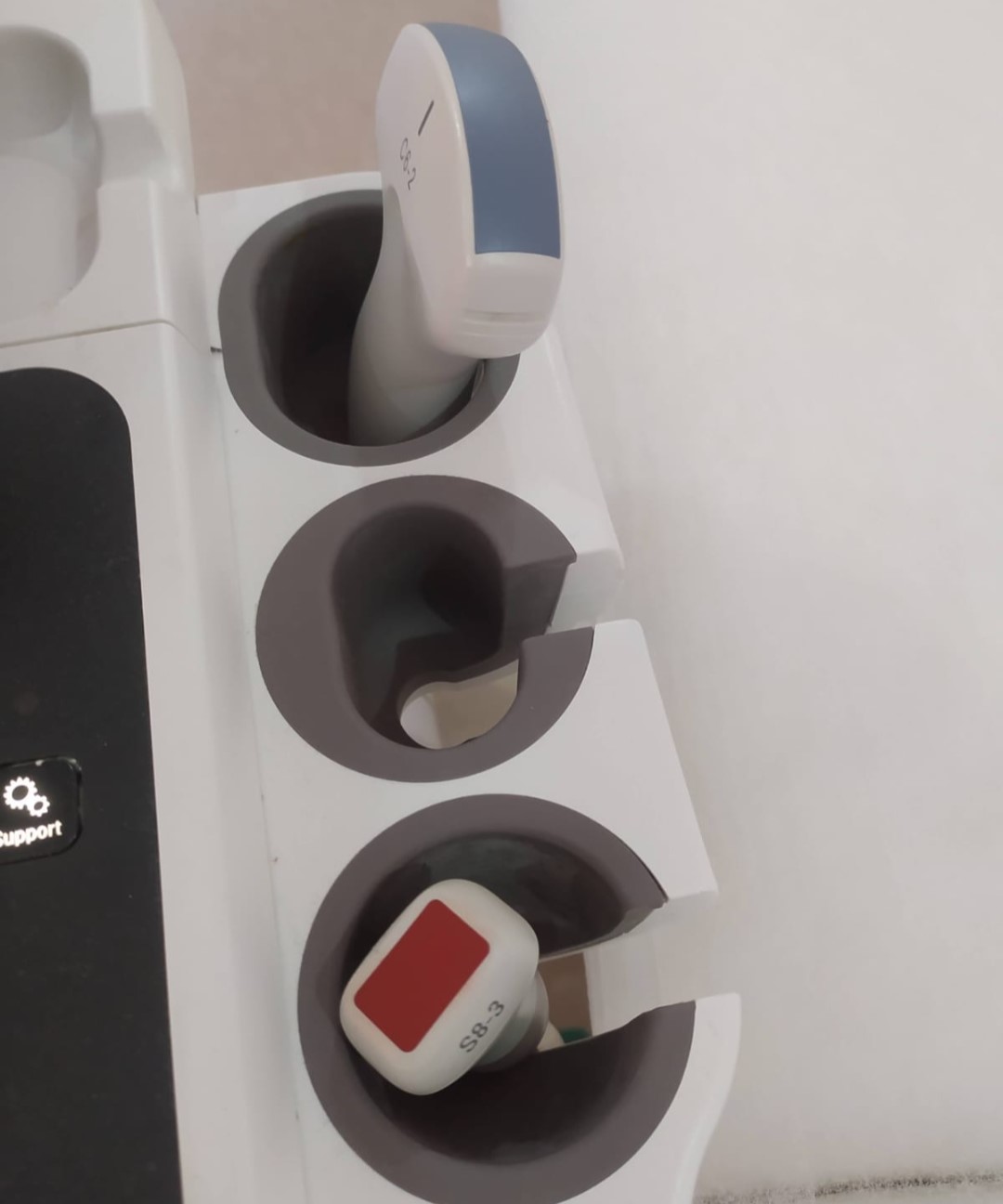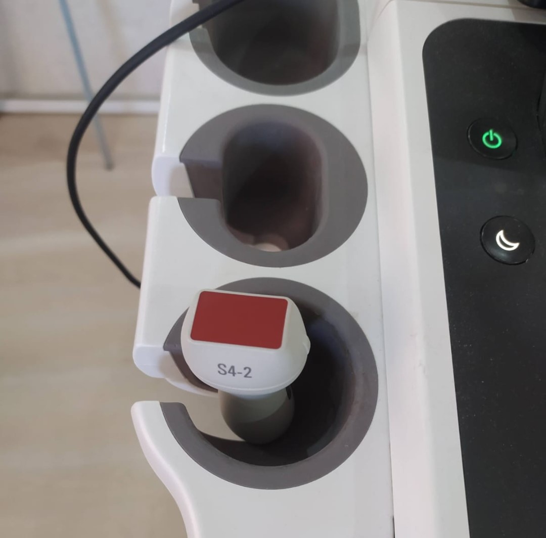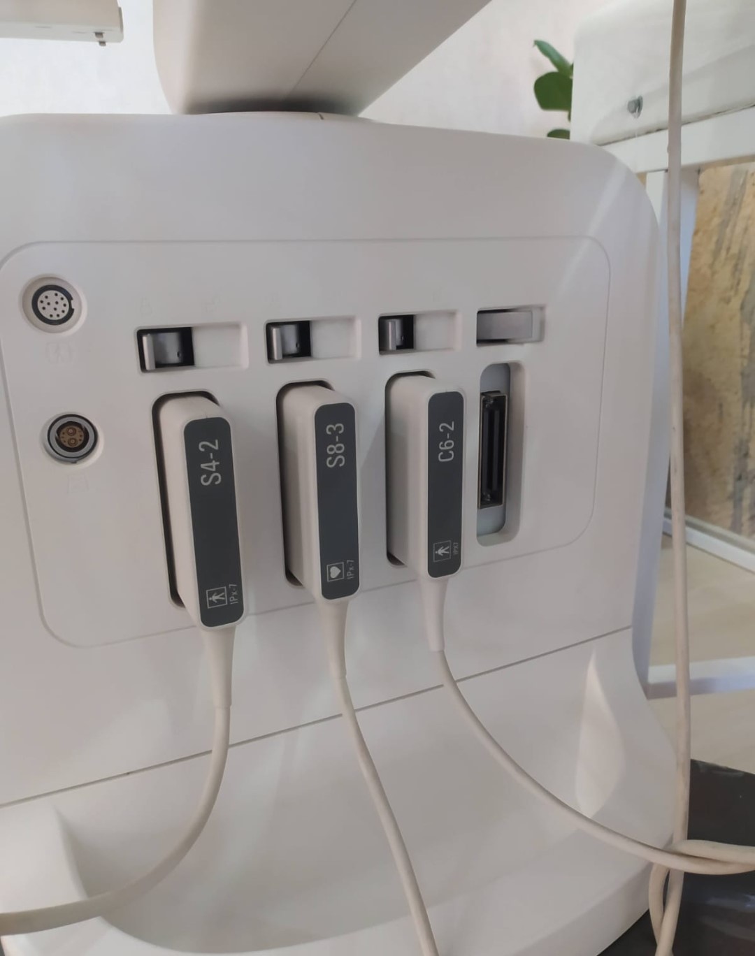 - Ultrasound Probes: A total of 3 probes are clearly visible, connected to the device and inserted into their sockets. The model codes readable on the probes are: S4-2, S8-3, and C6-2. Additionally, a fourth probe is located in the probe holder on the right side of the control panel. The physical condition of the probes and cables appears good.