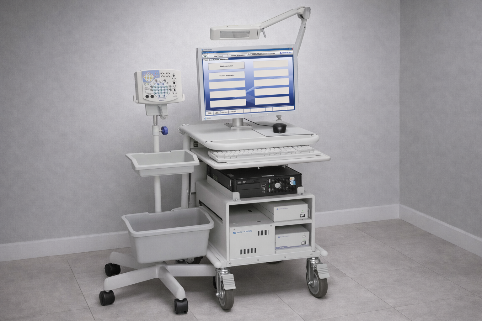 The examined image displays a comprehensive Electroencephalography (EEG) system, designed for medical diagnosis and neurological monitoring, mounted on a wheeled mobile workstation. The system is an integrated set consisting of a main data processing unit (PC), LCD monitor, amplifier (headbox), photic stimulator lamp, keyboard, mouse, and a dedicated trolley. The system shown is a professional medical device configured to record brain electrical activities in hospital and clinic environments.