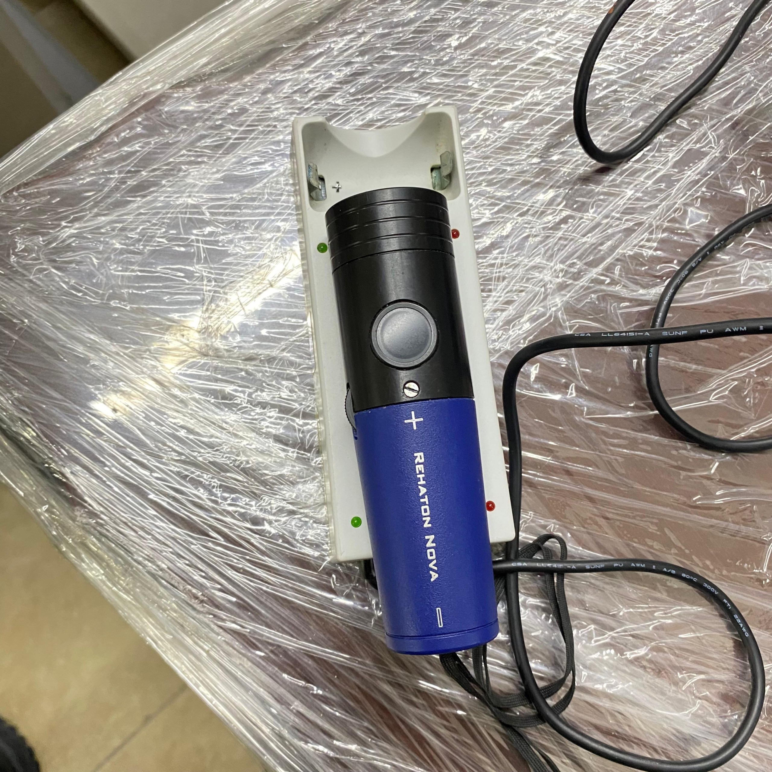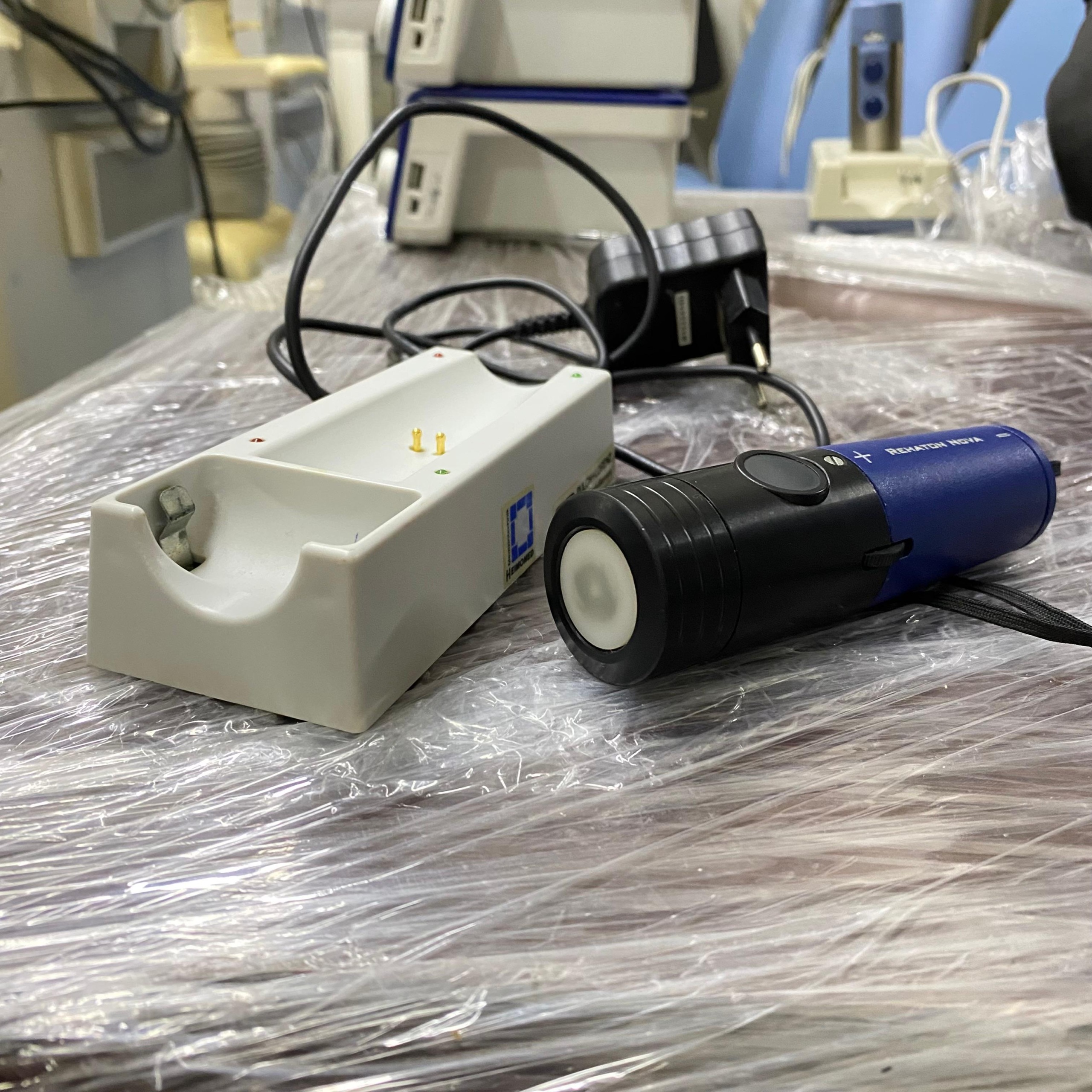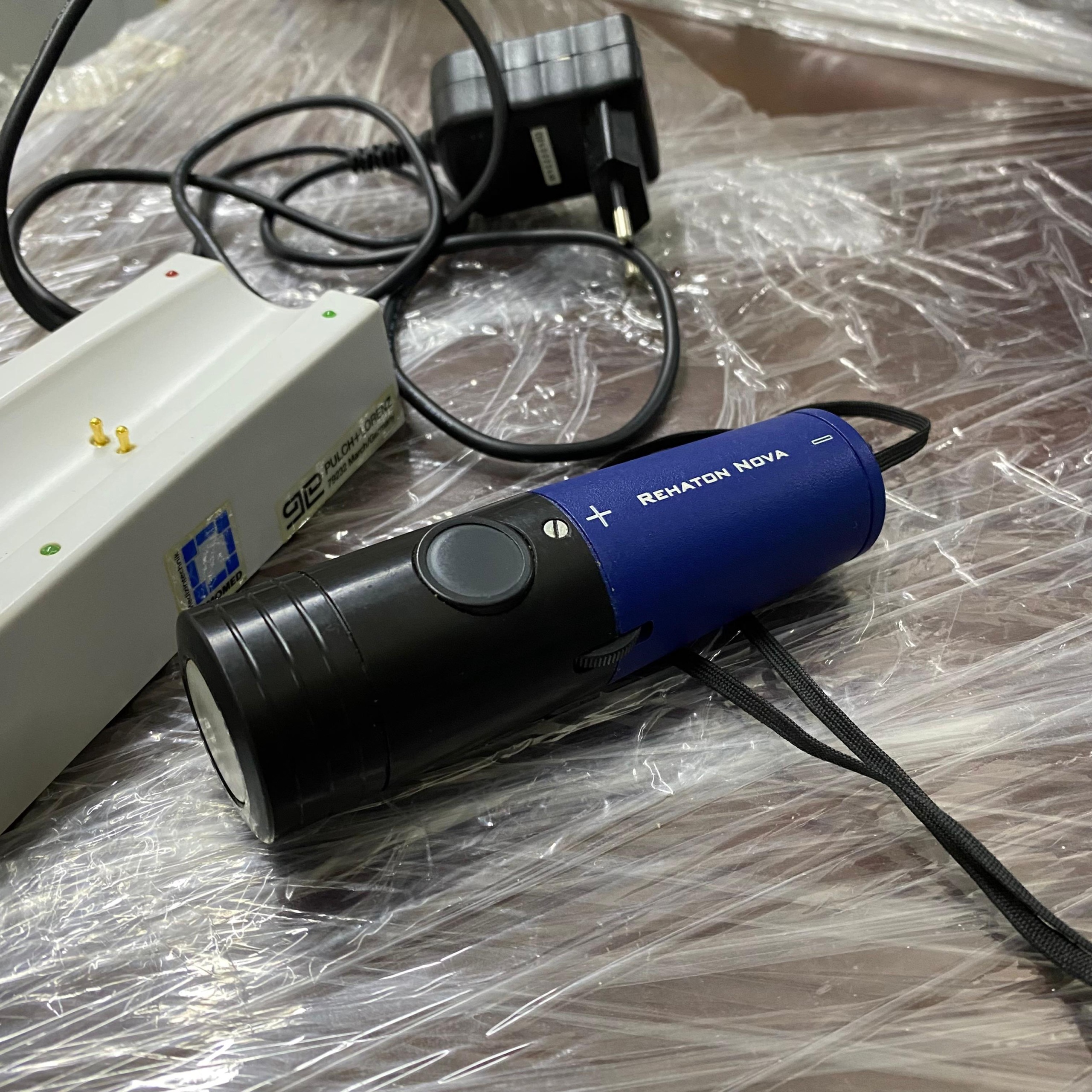 The inscription REHATON NOVA is clearly legible on the device’s body. On the charging unit, there is a logo and label belonging to the HEIMOMED brand. Accordingly, the product has been identified as the Heimomed Rehaton Nova model.