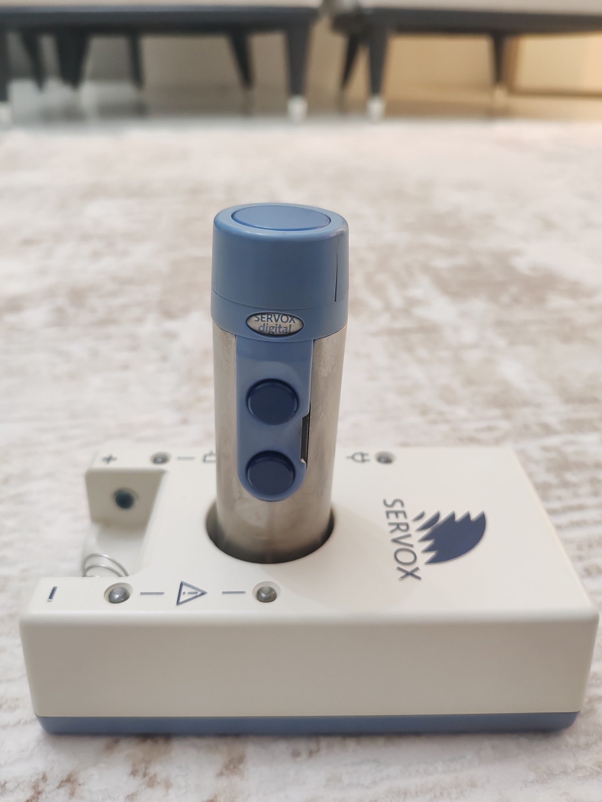 - Charging Ports and Pins: The charging pins and connection points on the charging unit are visually intact. The Servox Digital device appears to fit perfectly into the charging unit.