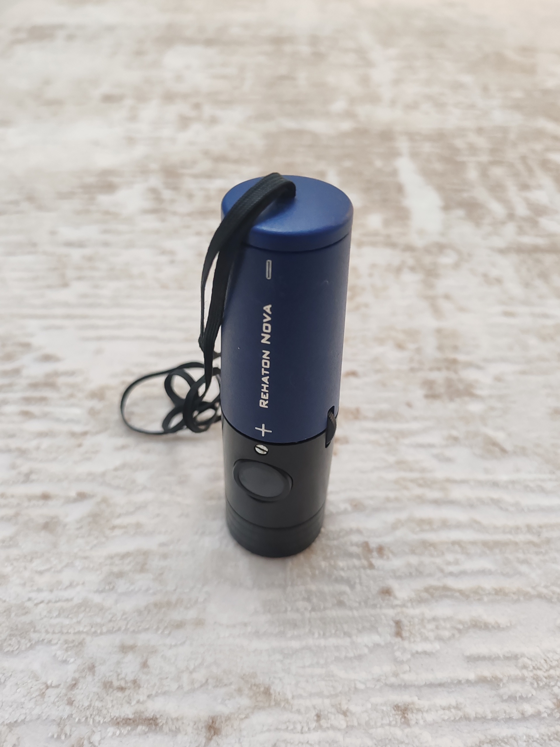 - Rehaton Nova: No visibly large scratches, dents, or cracks are present on its blue and black body. The neck strap is attached to the device.