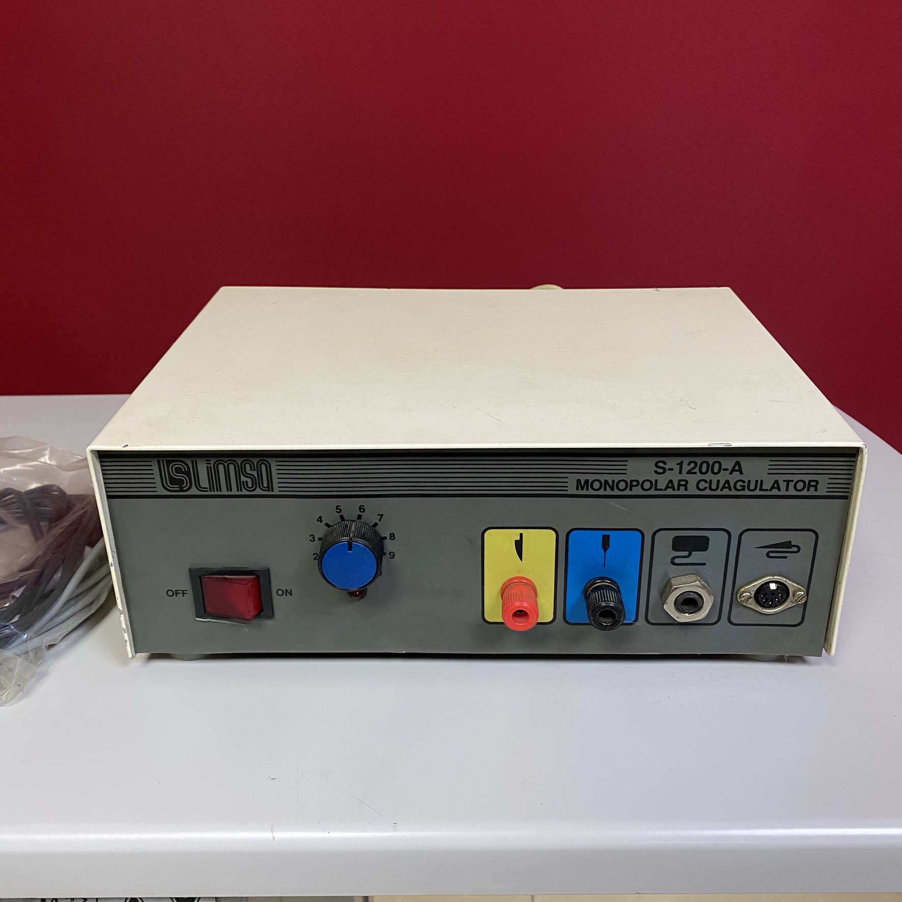 The device shown in the visuals is an electronic device used in medical surgical interventions. Upon examining the inscriptions and control elements on the device’s front panel, it has been determined that this product is a “Monopolar Cuagulator” (Monopolar Coagulator/Cautery) of the LIMSA brand, model number S-1200-A. The brand logo “LIMSA” is written in a stylized font. The identification on the front face of the device clearly confirms that the product is used in surgical bleeding control (coagulation) procedures.