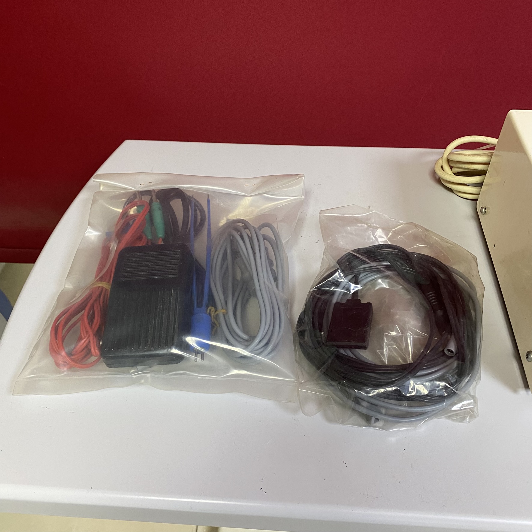 Among the bagged accessories provided, there is a black foot pedal, probes, and interconnecting cables, which are understood to be compatible with the device. While the accessory packages are sealed, preventing a detailed view of the individual condition of their contents, it can be observed externally that the cable insulations are intact and there are no breaks.