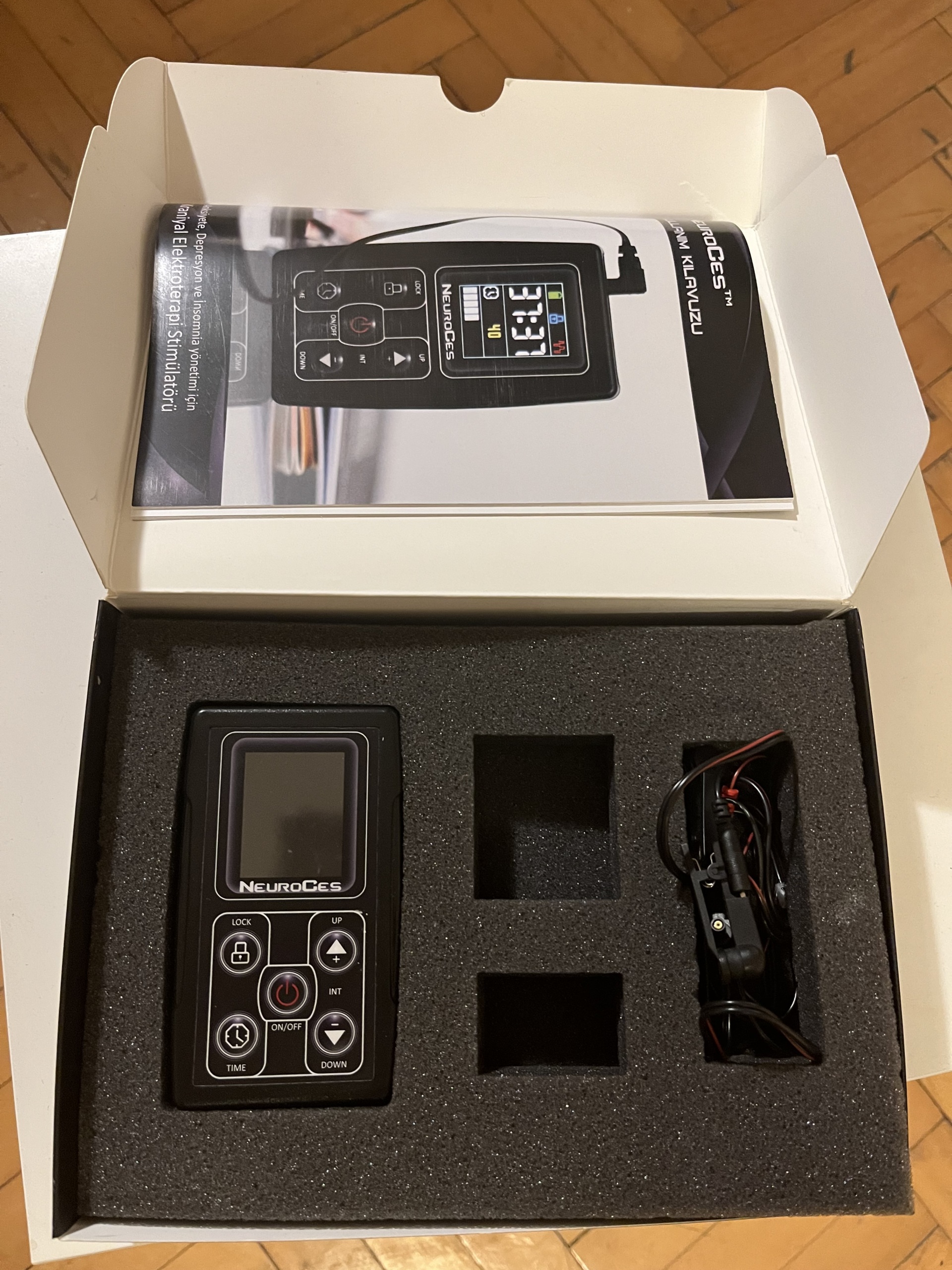 According to the information on the box and in the user manual, this device is a medical support device designed for use in the management of anxiety, depression, and insomnia. The product operates by delivering low-level electrical stimulation via electrodes attached to the earlobes.