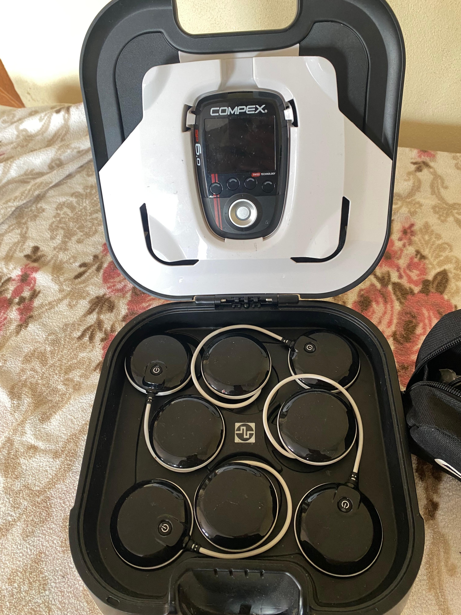 The product in the images is an electrostimulation device used for muscle stimulation and physical therapy purposes. Based on the inscriptions on the main unit of the device, its brand has been definitively identified as Compex, and its model as SP 6.0. The inscription SWISS TECHNOLOGY is located in the bottom right corner of the main unit’s screen.