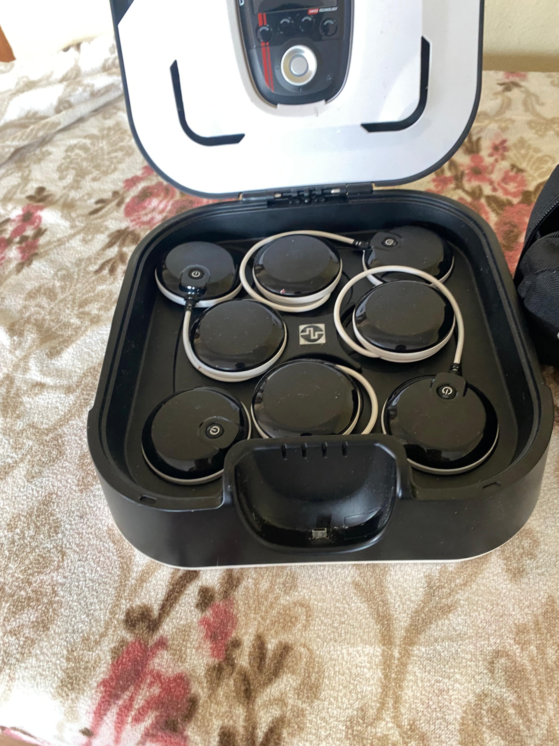 - 4 pairs (total 8 units) wireless electrode modules (connected by short white cables)