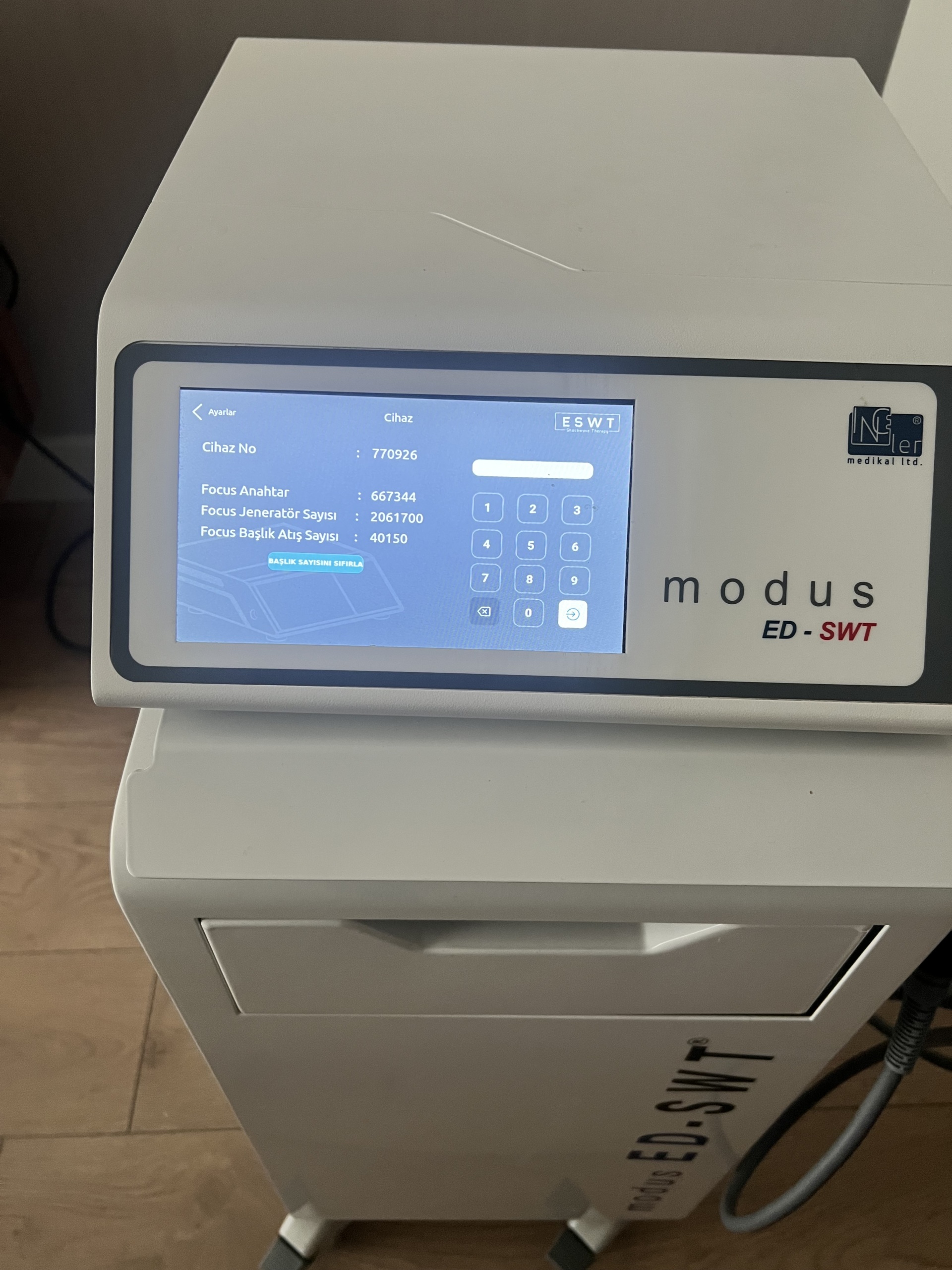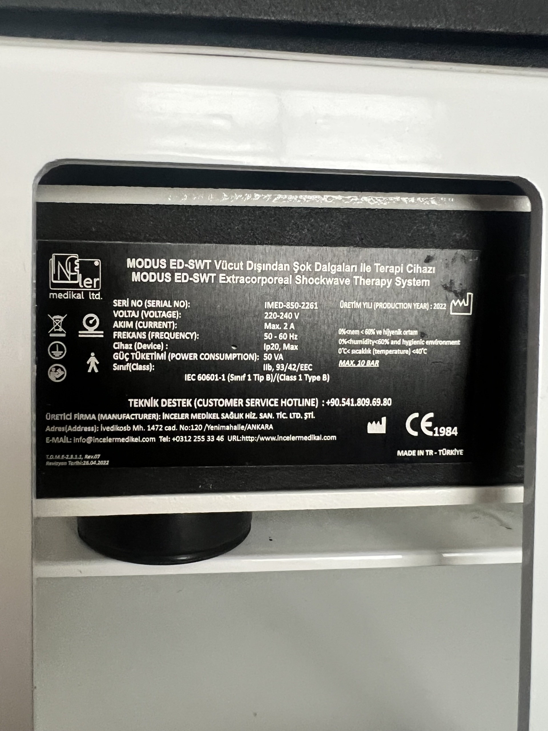The Inceler Medikal Modus ED-SWT device, being a 2022 production, is a second-hand medical device with modern technology, cosmetically very clean (8.5/10), and with functional electronics. Despite having a total shot count of over 2 million, it appears well-maintained, and the current applicator’s condition is active. Based on visual analysis, it is assessed as being directly ready for use in a clinical setting.