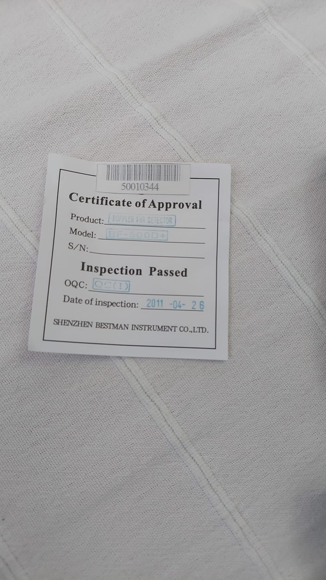 The device shown in the visuals is a Bestman brand BF-500D+ model Fetal Doppler device. This product is used to listen to the fetal heart rate (FHR). The manufacturer’s information, CE mark, and the certificate of approval provided with the product indicate that the product is original. The analyzed set consists of one main unit, one probe connected to the device, and one certificate of approval.