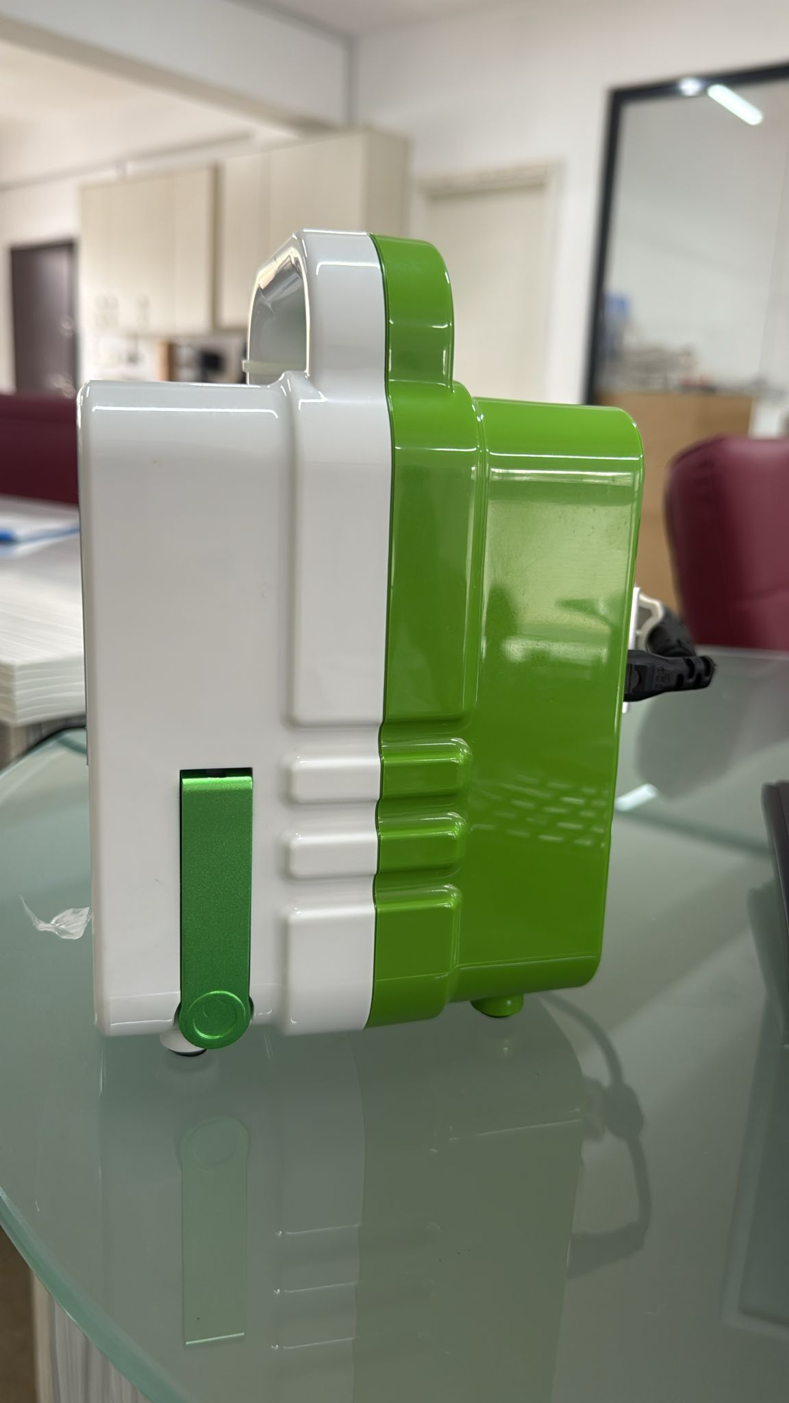 The external cosmetic condition of the device has been evaluated as “New” or “Near-New”. The strongest visual evidence for this assessment is the transparent protective gelatin film located on the device’s keypad (control panel), which has not yet been fully removed. There is no yellowing, stain, or sign of use on the device’s white and blue (teal) front surface. The glossy green plastic components forming the rear casing also appear extremely clean and scratch-free.