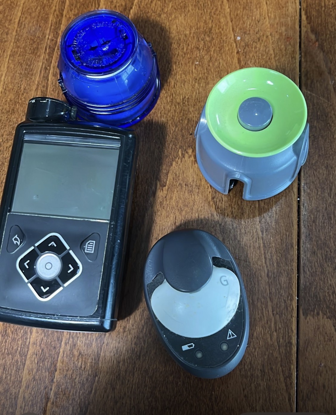 - Insulin Pump: There are noticeable peeling and abrasions on the paint or coating in the upper left corner of the device (near the reservoir cap). Dust and dirt accumulation are observed on the casing and between the buttons. The screen is off, but there are scratches on the screen protector plastic due to use.
