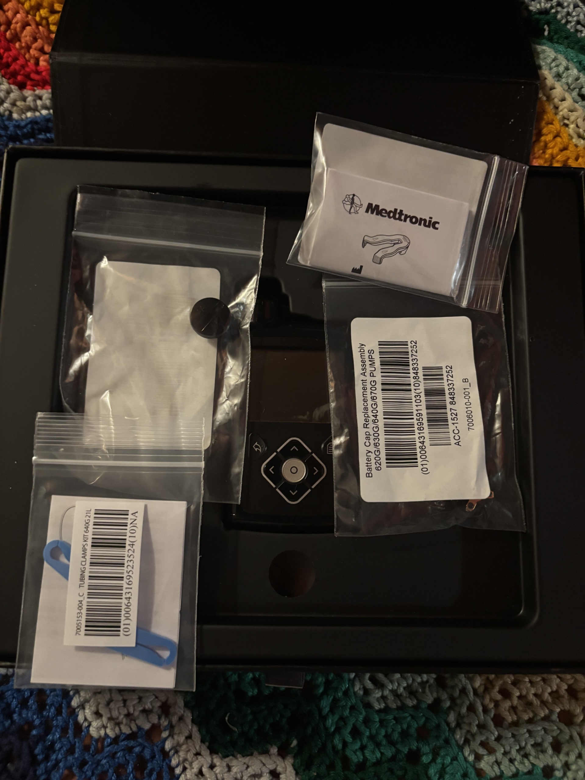 The examined visuals include an insulin pump, a medical device used for diabetes management, along with its user manual and spare part accessories in sealed packaging. The product is displayed as a set, within its original box.