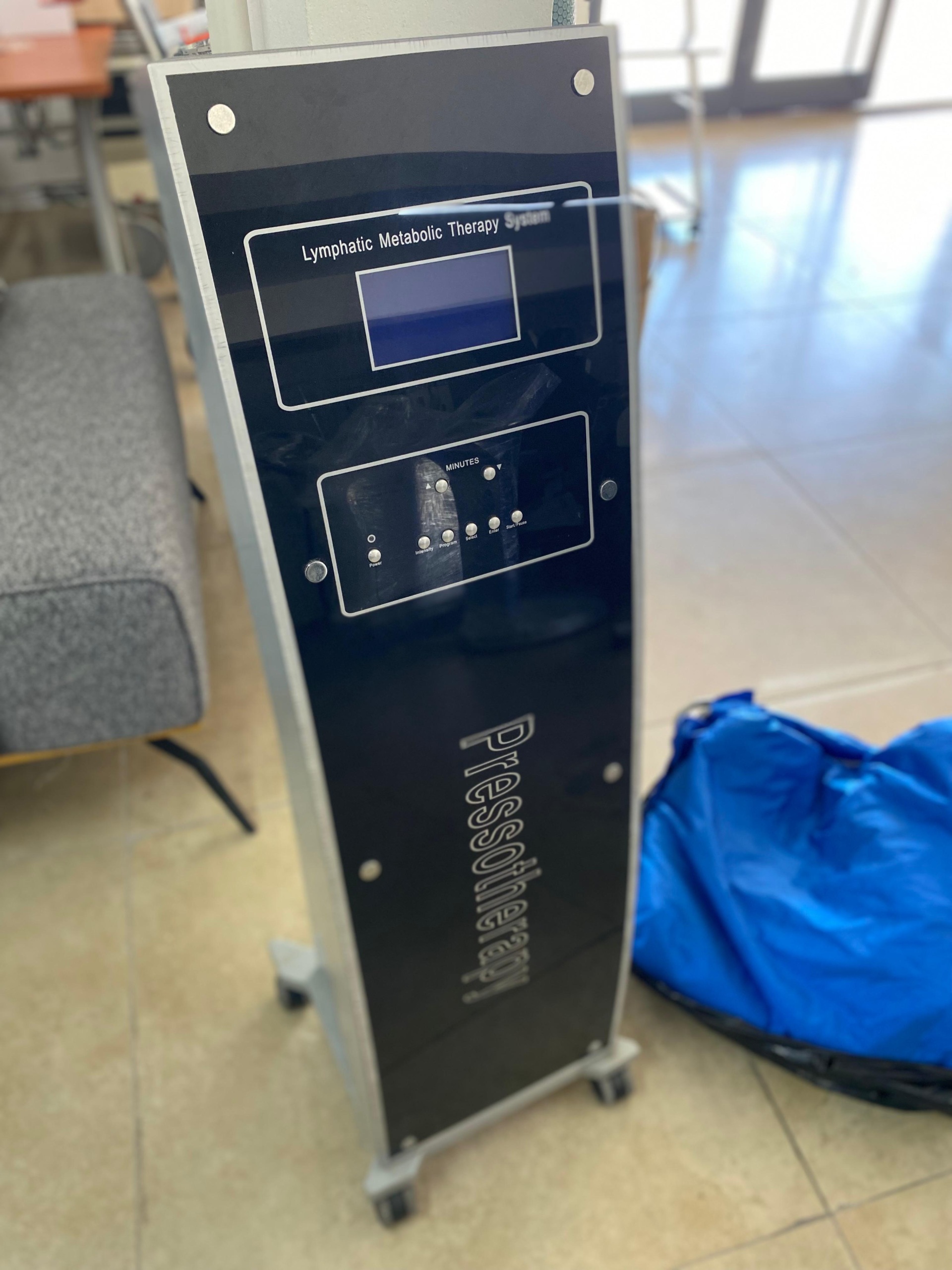 The device shown in the visuals is a pressotherapy (lymphatic drainage) device, as understood from the phrases “Lymphatic Metabolic Therapy System” and “Pressotherapy” on it. Such devices are used to accelerate lymphatic circulation in the body and support metabolic activities. The device’s vertical and wheeled structure enhances its portability.