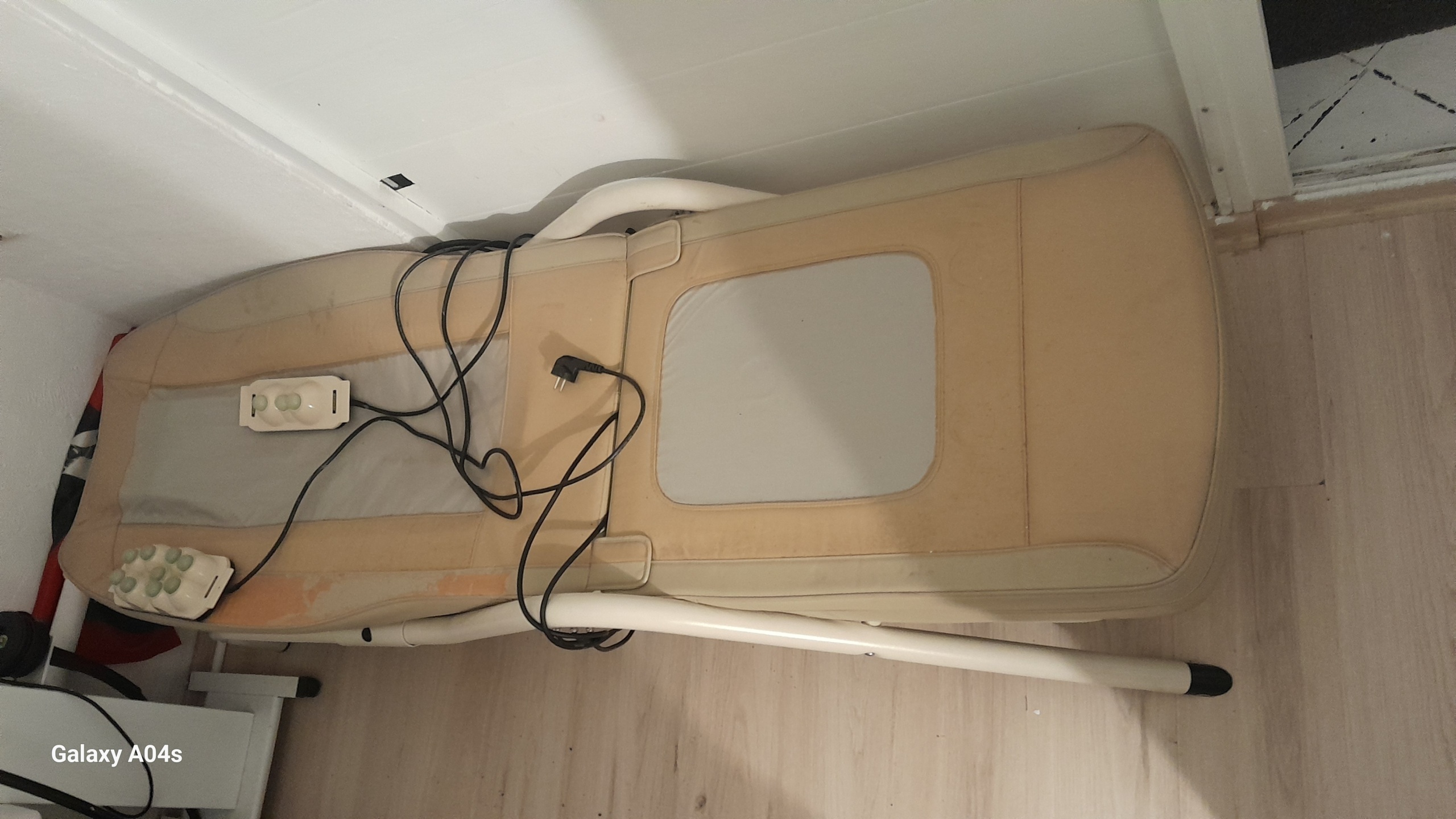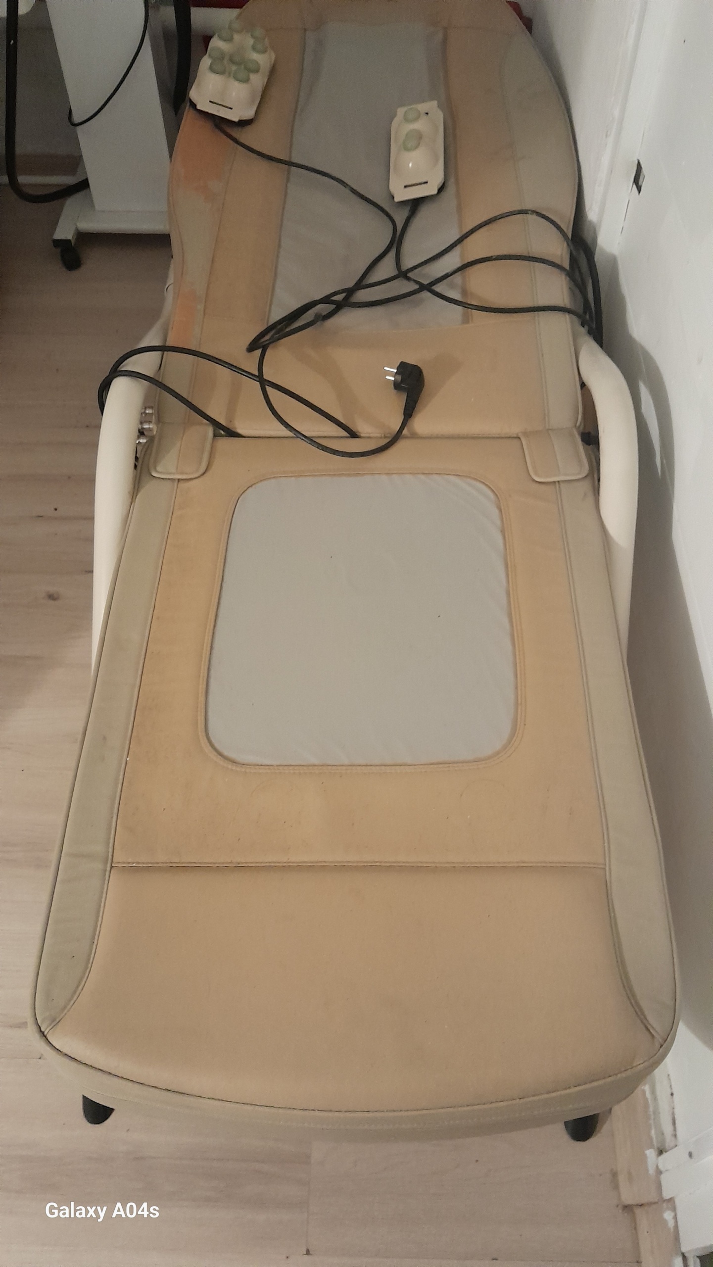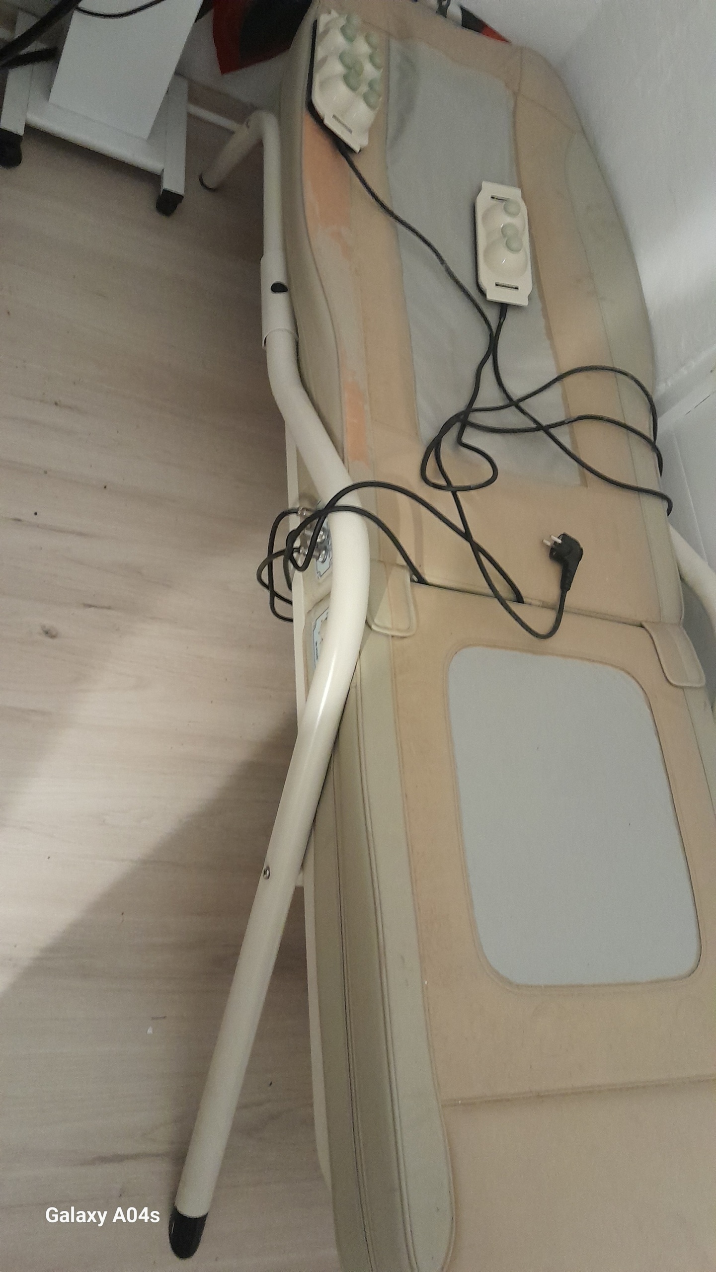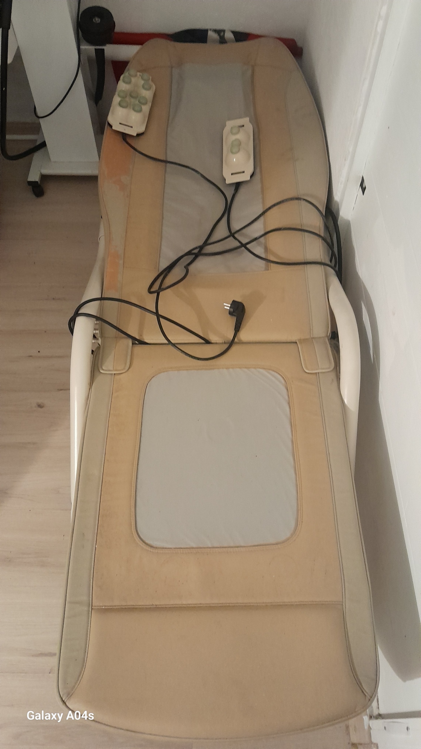 Since the product shows significant aesthetic wear and tear, the condition of the unseen moving mechanism inside the bed (roller/motor system moving along the spine) cannot be confirmed from the visual. The excessive color change and deformation in the upholstery indicate that the device has been used for very long hours. Therefore, the moving parts may require lubrication or maintenance. Furthermore, with older generation devices, the risk of cables stiffening over time and breaking internally (loss of contact) should be considered. However, from an external perspective, there is no obvious breakage (e.g., body crack) that would prevent the device from operating.