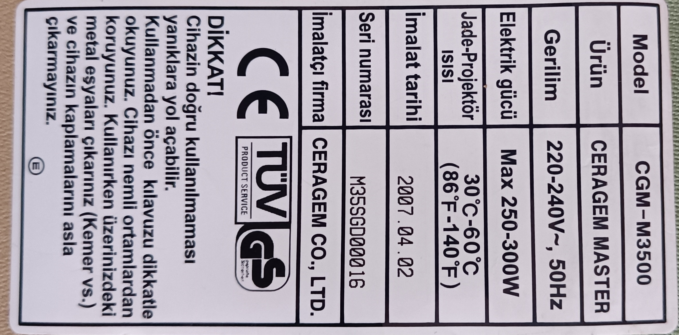 The quality of the label print on the product, the use of the logo, the regular placement of “TÜV” and “CE” certification marks, and the compatibility of the brand logo with the product’s accessories (cover, remote control) indicate that the product is an original CERAGEM production. The fact that the label is intact and legible has facilitated the verification of the device’s identity.