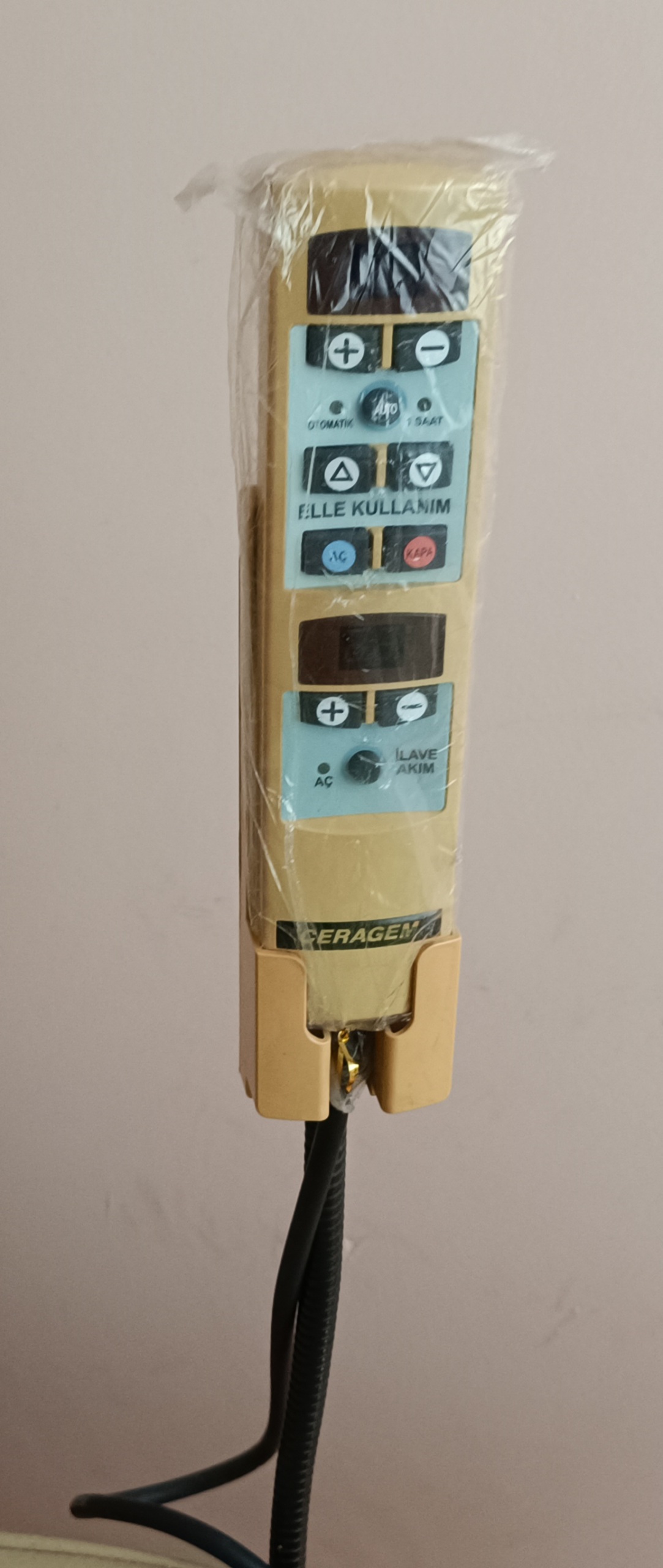 The device’s supporting metal profiles appear sturdy. Although the remote control cable and projector cable are bent in the visual, no visible breaks or peeling in their outer insulation were detected. It is understood from the keypad that the remote has “Automatic” and “Manual” modes and that heat settings (+/-) can be adjusted.