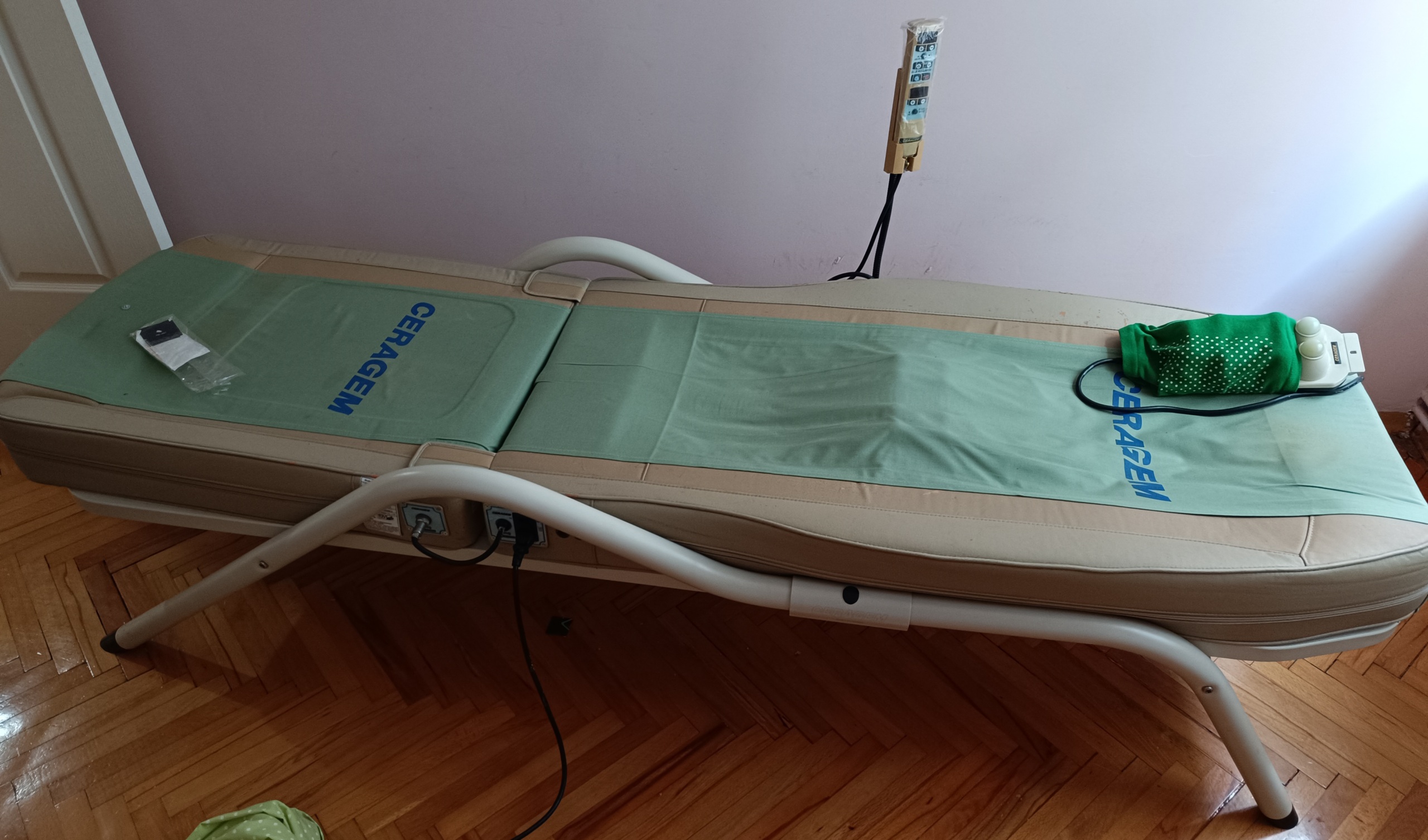 The examined CERAGEM CGM-M3500 Thermal Massage Bed is a 2007 production, original, and a complete set with all essential accessories (remote control, external projector, protective cover). This model, produced for the Turkish market with a Turkish interface, appears to have preserved its physical integrity and to have been well-maintained.