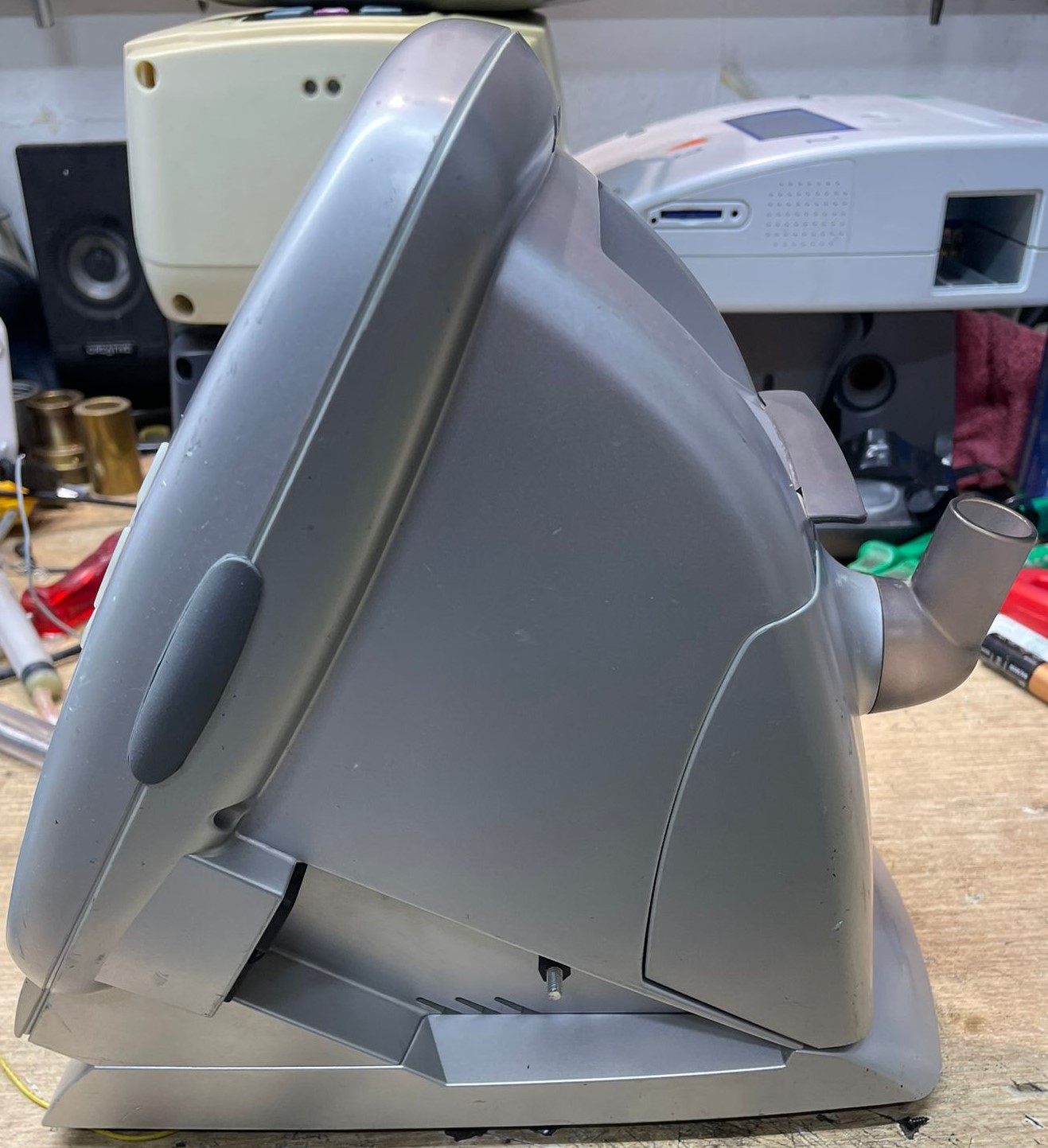 The device is used and in moderate cosmetic condition. Its grey outer plastic casing has various scratches, scuff marks, and small stains. Dust and dirt accumulations have been observed in the gaps around the buttons, at the casing joints, and in the ventilation grilles on the bottom. A small metal pin or screw protruding outwards from the casing is noticeable on the lower part of the device’s right side panel.