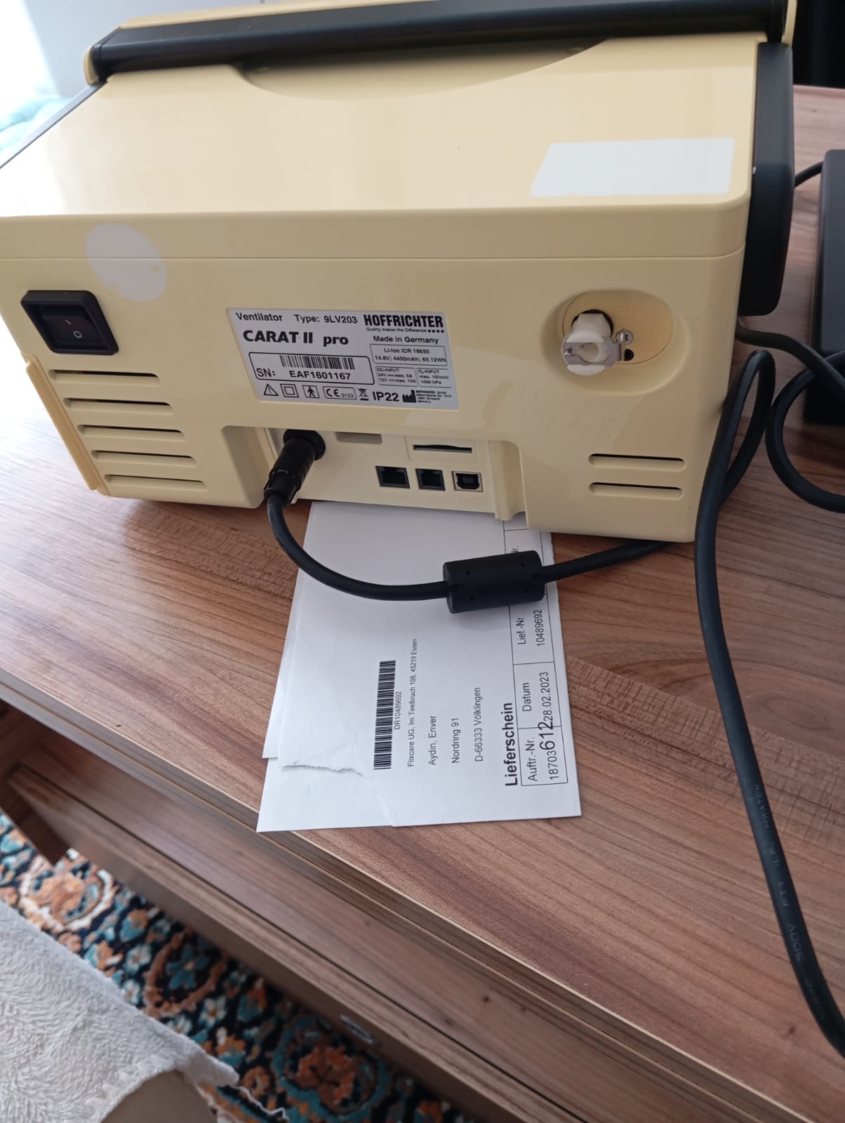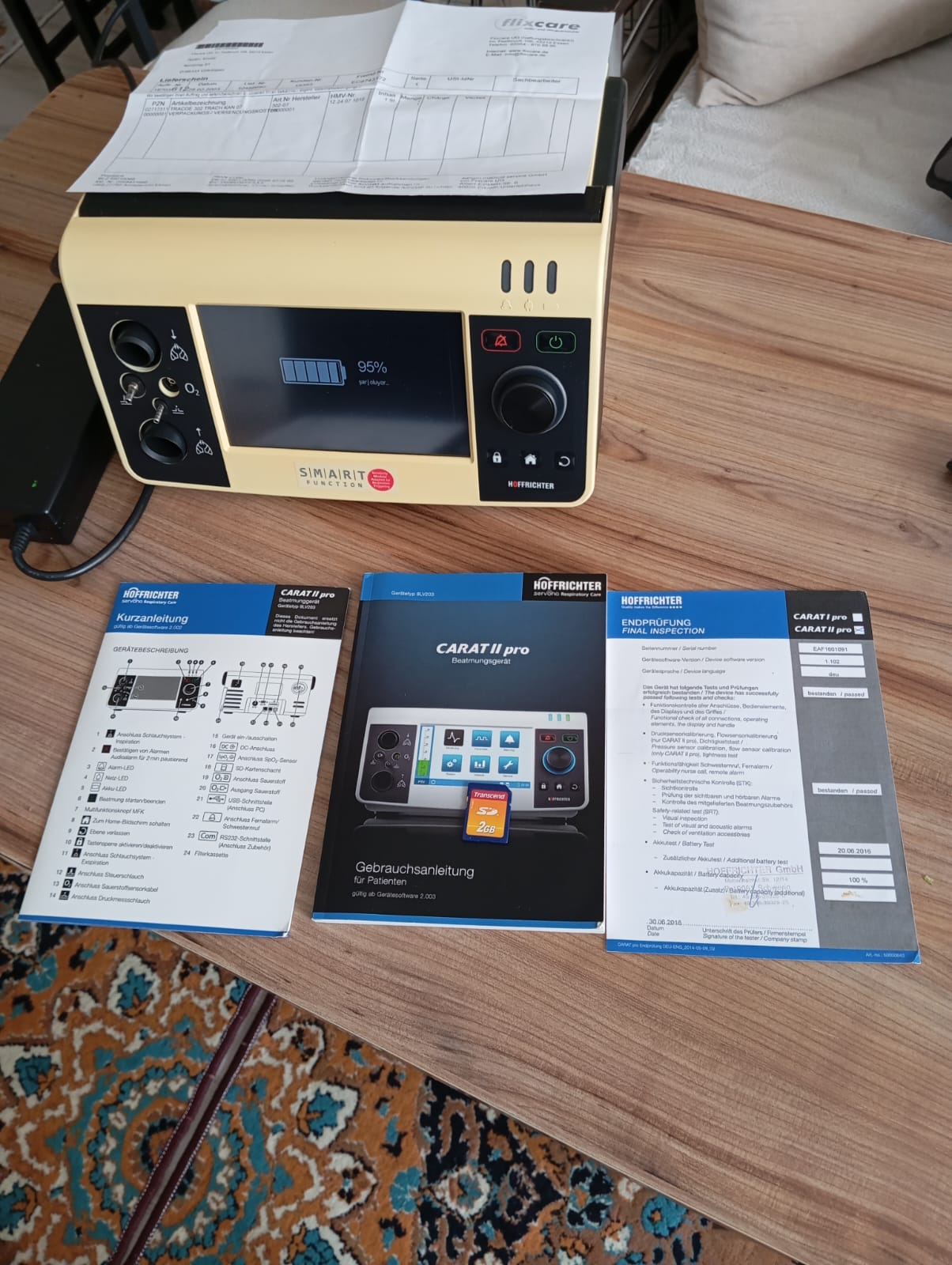 The product in the images is a Hoffrichter brand Carat II pro model mechanical ventilator and its accessories.
