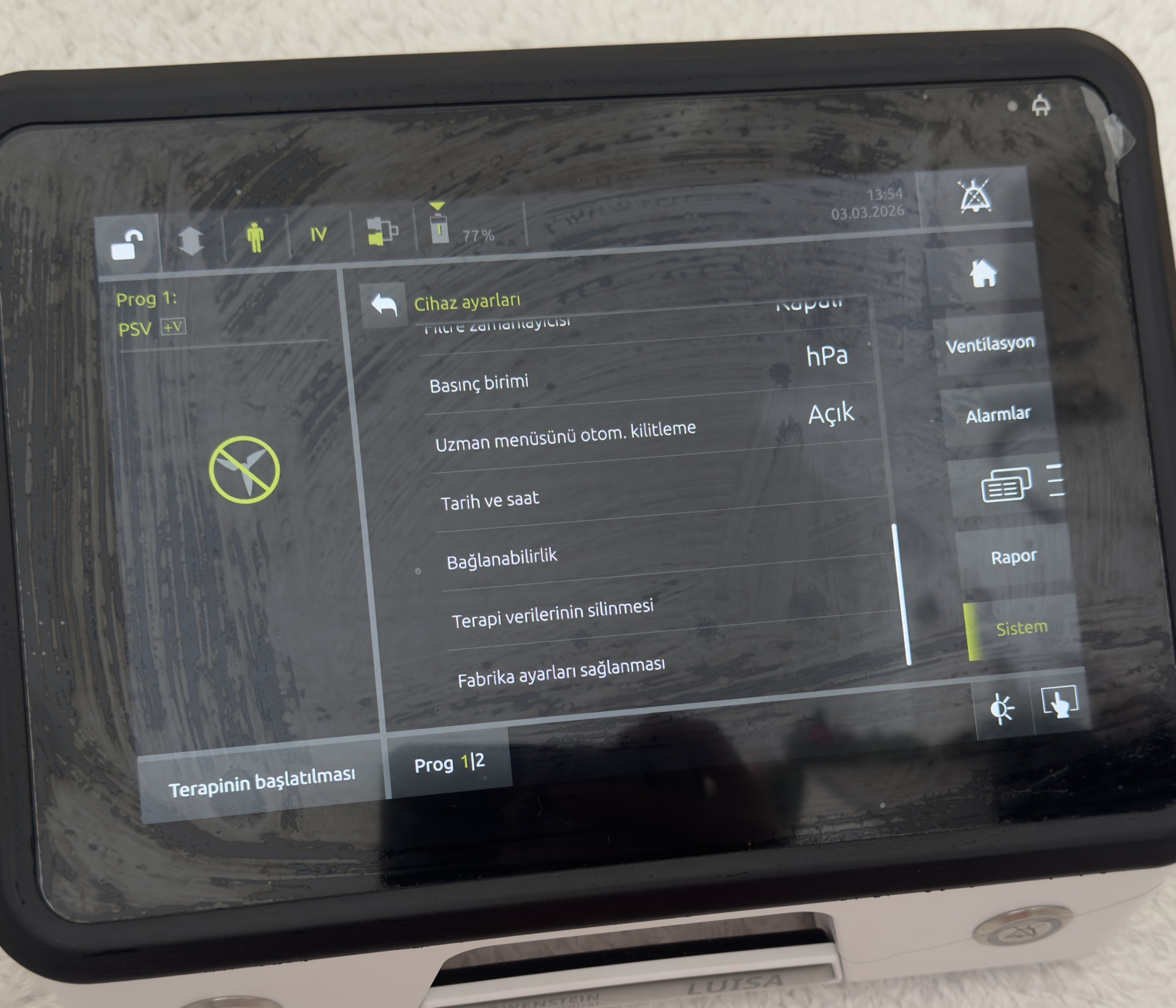 Brand and Model: The logo and model inscription on the front panel of the device in the visuals are clearly readable as “LÖWENSTEIN medical” and “LUISA”. Visual confirmation has verified the device as a Löwenstein Medical LUISA model mechanical ventilator.
