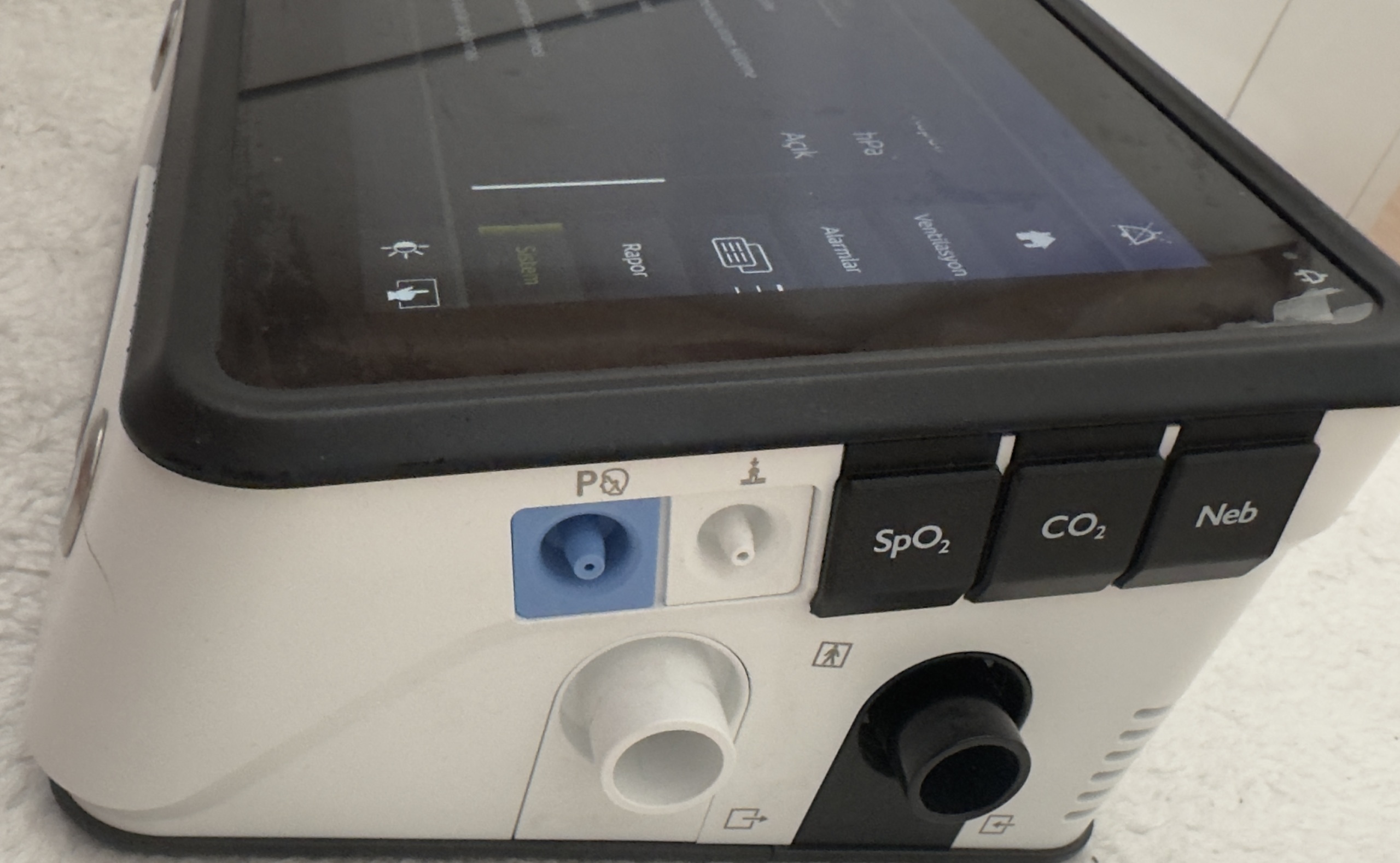 Ports and Inputs: The patient circuit outlet on the side panel appears clean. The P (Pressure) measurement input is blue and intact. SpO2, CO2, and Nebulizer ports are covered with black caps (blind plugs are installed); no bending or oxidation of pins was visually detected.
