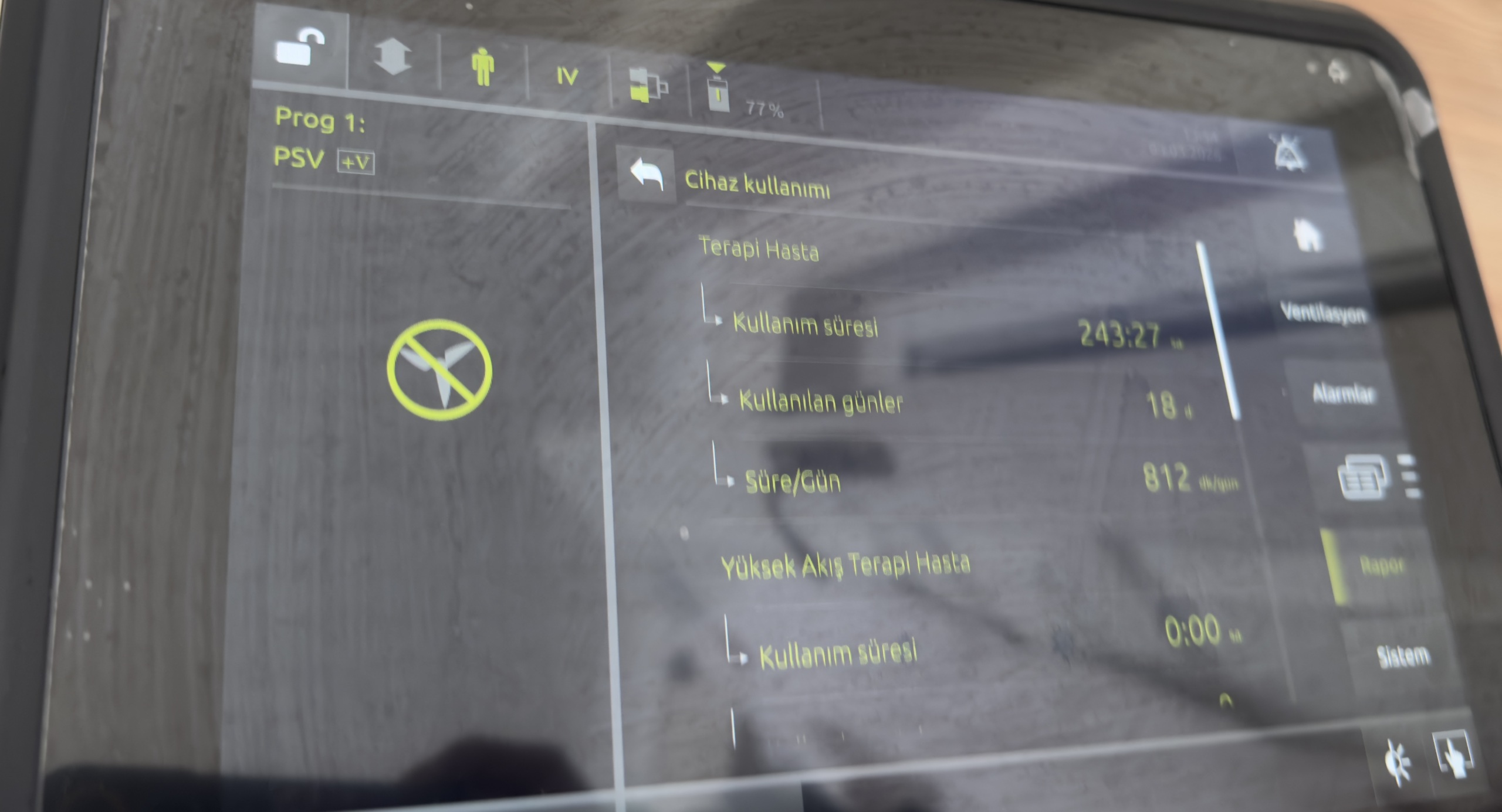 - Menu Accesses: “Ventilation”, “Alarms”, “Report”, and “System” menus are active.