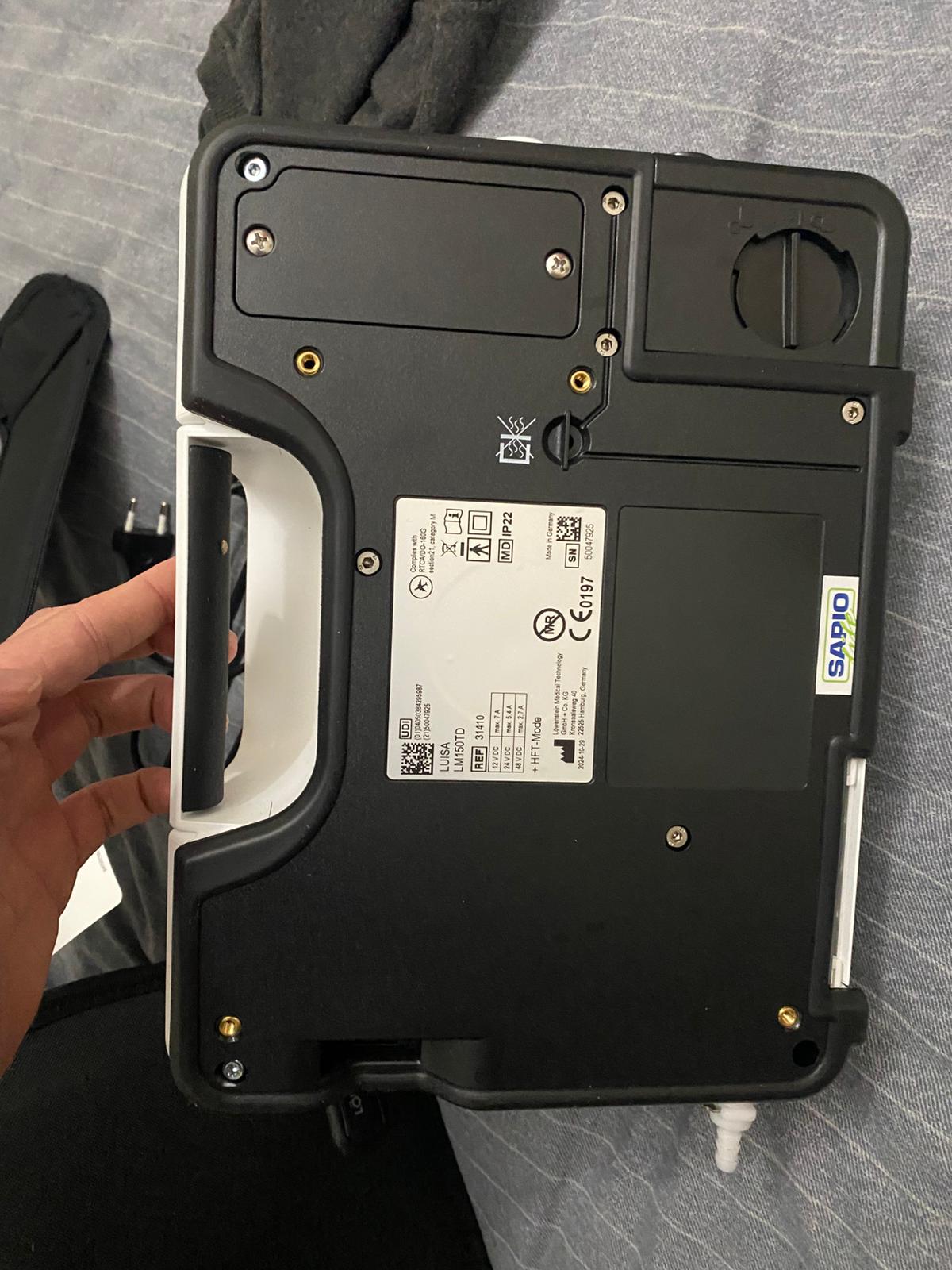 The product in the image is a portable medical device. According to the manufacturer’s label on the device’s rear panel, its brand is Löwenstein and its model is Luisa LM150TD. There is also a label with the inscription Sapio Life on the right side of the device.