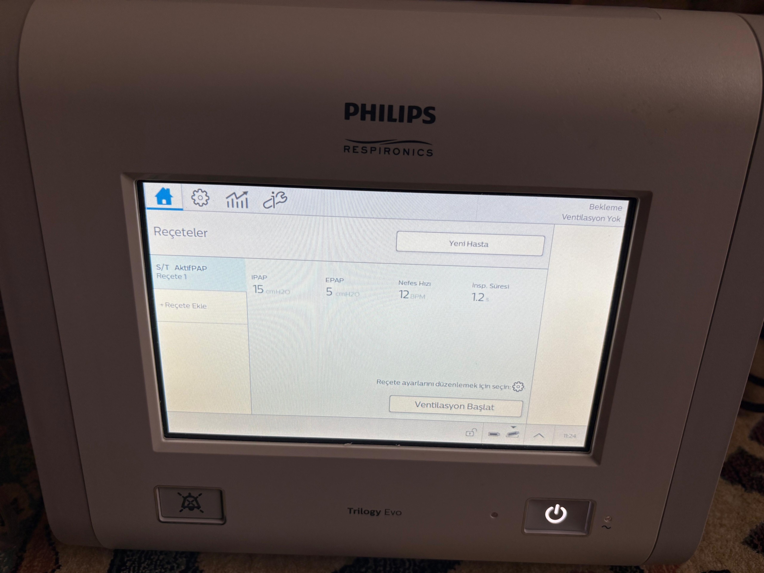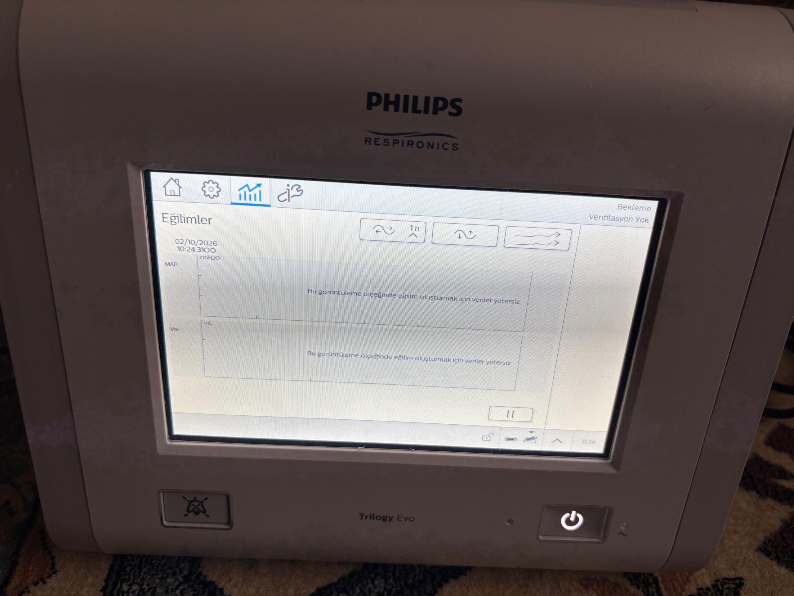 As a result of the visual analysis, no critical physical or software-related (“Service Required” etc.) malfunction has been detected in the device. The “Insufficient data” warning on the “Trends” screen is not a malfunction; it indicates that the device has not been operated recently to collect data or that a new patient record has been started (The “New Patient” button is already visible on the screen). Considering the mechanical components, casing integrity, and screen brightness, it is assessed that the cosmetic and technical condition of the device is good, and no immediate risk of malfunction is apparent.