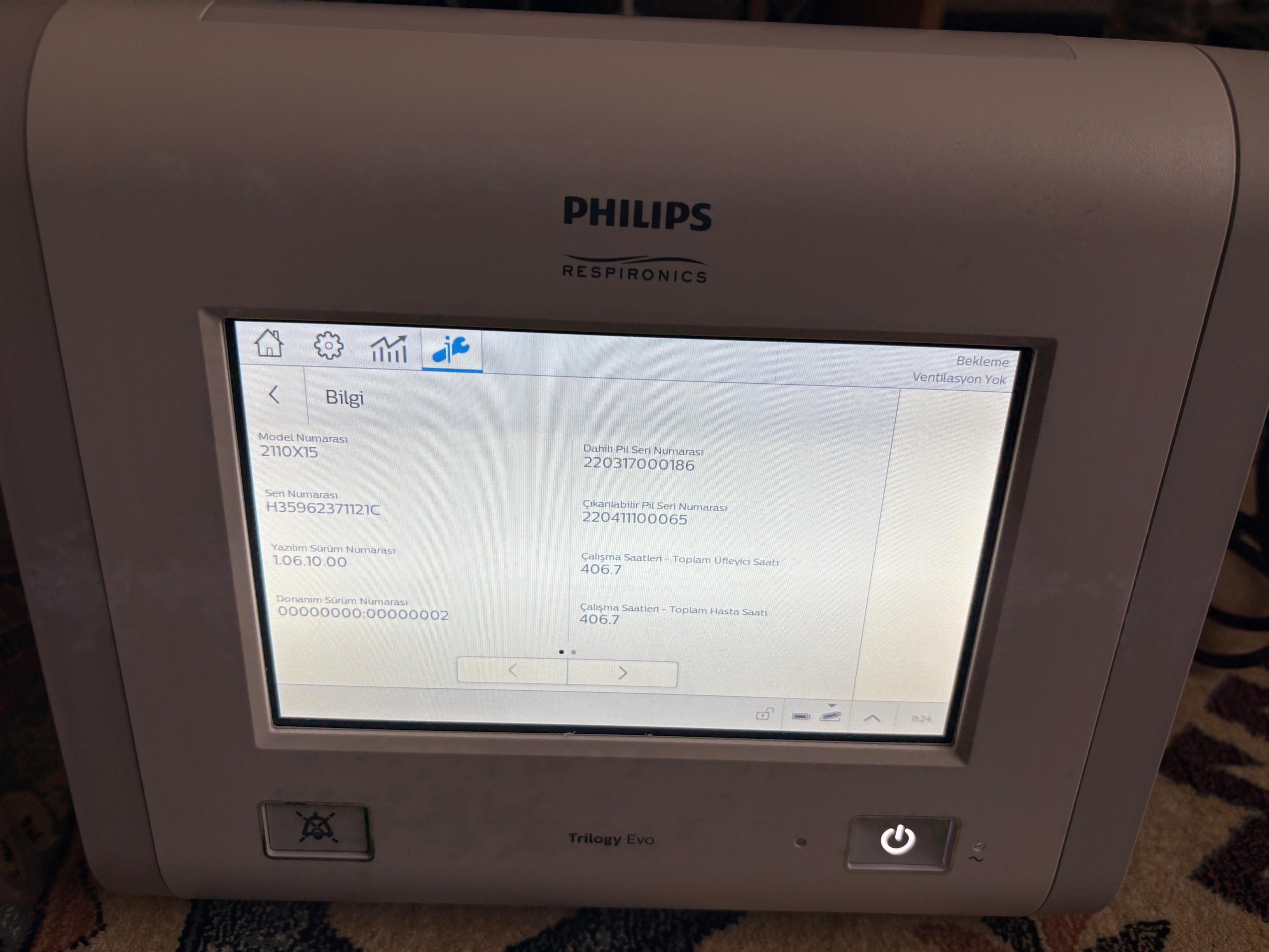 According to the data obtained from the device’s system information screen (Image 3), the technical model number has been confirmed as 2110X15. In light of this information, it has been confirmed that the product is a life-support respiratory device designed for use in hospital and home care environments.