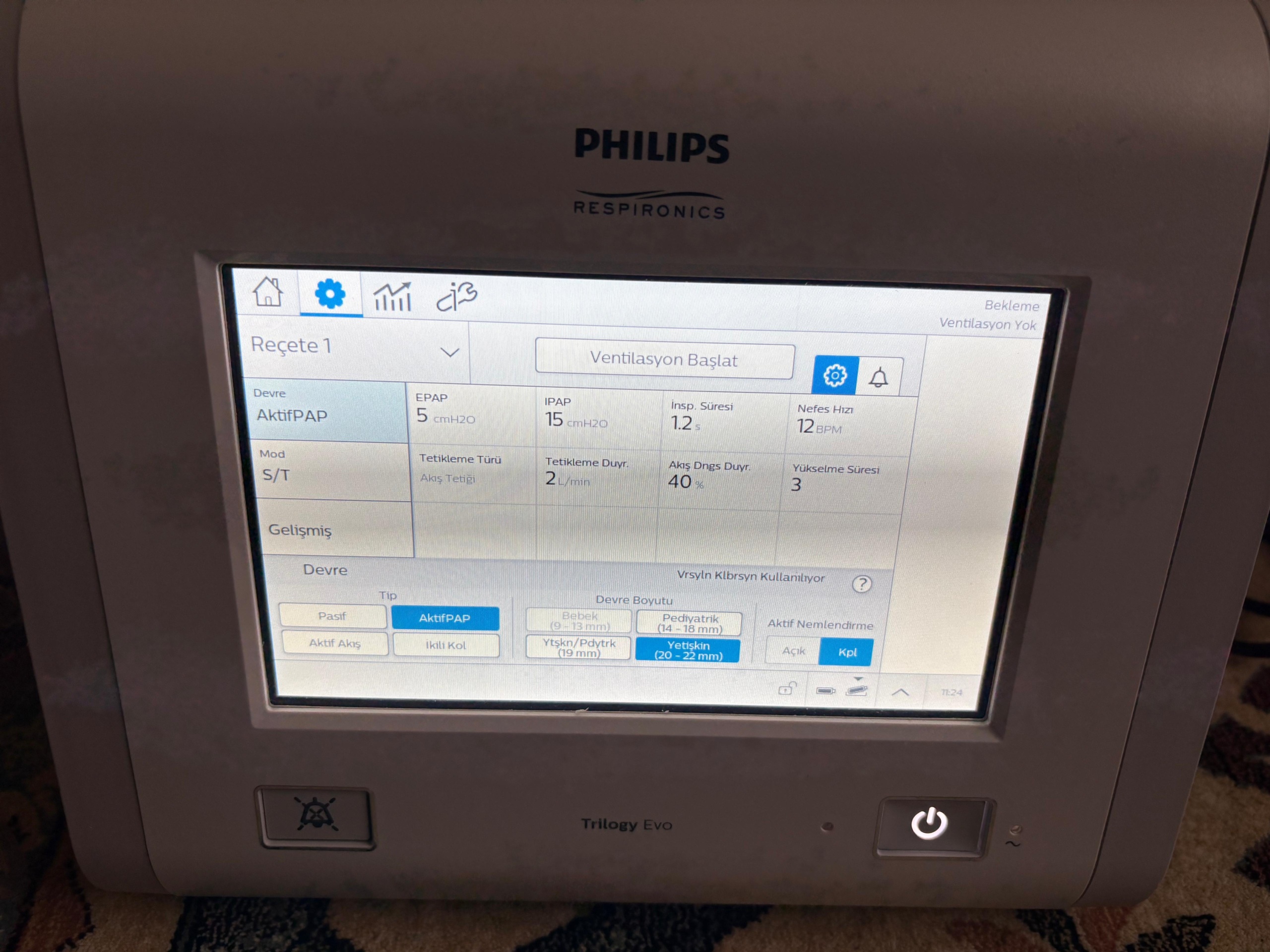 - Patient Type Setting: In the device menu (Image 5), under the circuit settings section, the “Adult” (20 – 22 mm circuit) option is seen as active. Additionally, “Infant” and “Pediatric” options are also available in the menu, indicating that the device is suitable for a wide range of patient spectrums.